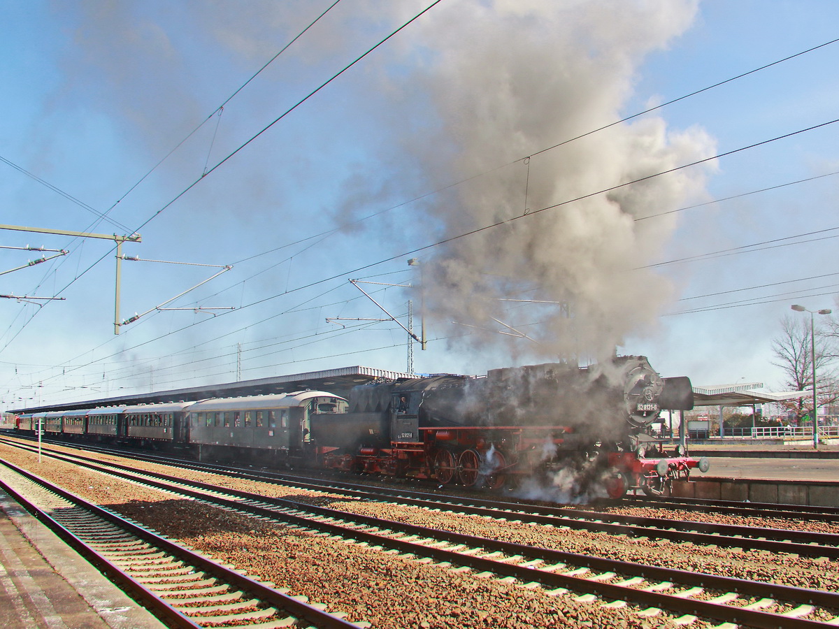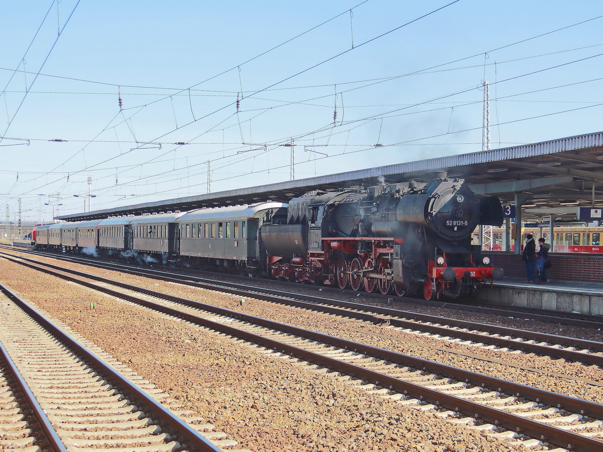 Dampflokftreunde Berlin schicken am 14.04.18 mit der 52 8131-6 (90 80 0051 131-5 D-WFL) die anlässlich eines Reisemarktes ihren historischen Eilzug aus den Dreißigern auf Rundfahrt durch Berlin fährt, hier bei der Vorbeifahrt Berlin Karlshorst Richtung Berlin Köpenick zum Umsetzen der Lok zur Rückfahrt des Zuges. Lothar Stöckmann