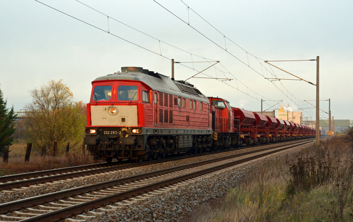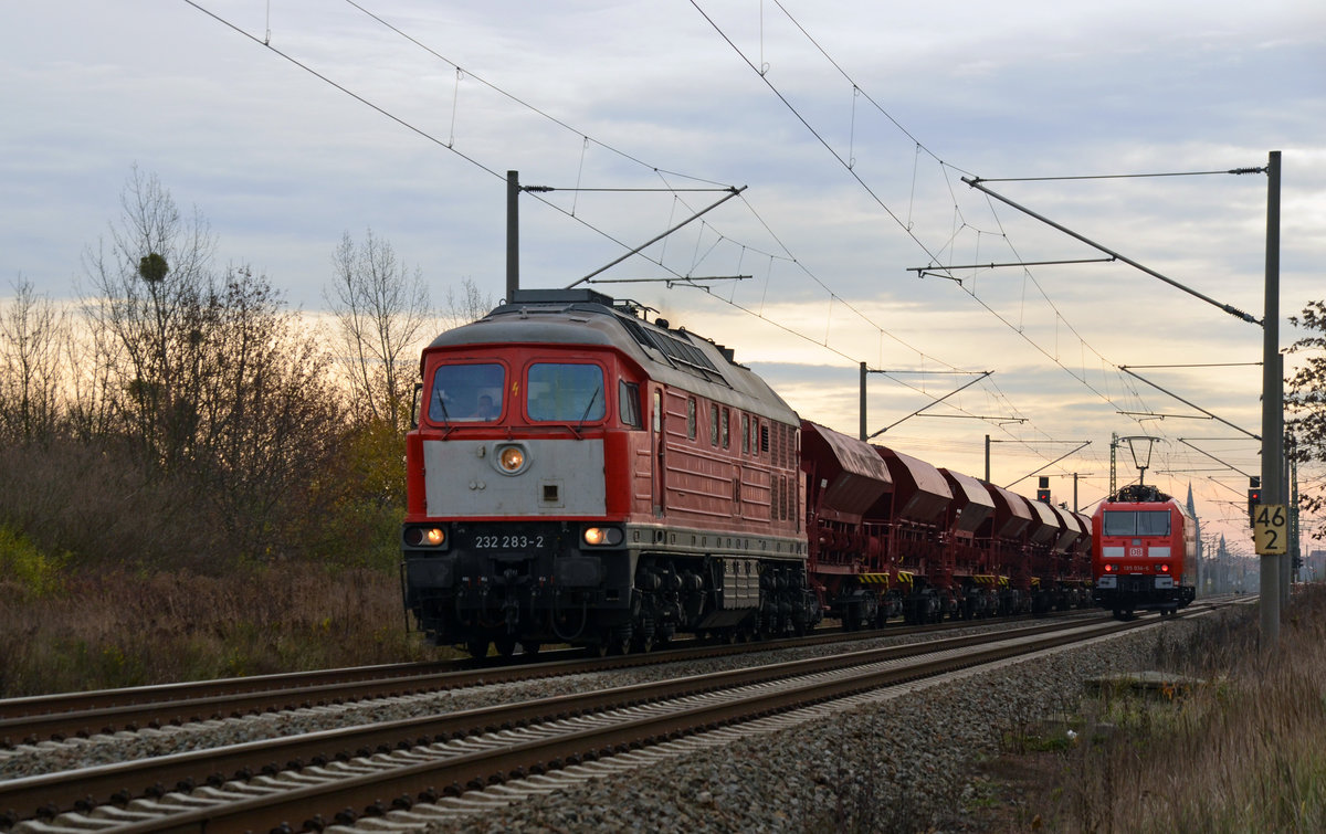 Am Morgen des 22.11.16 führte 232 283 der WFL neben 203 113 einen Schotterzug durch Greppin nach Bitterfeld. In Bitterfeld wurde ein Teil des Zuges abgestellt. Martin Schneider