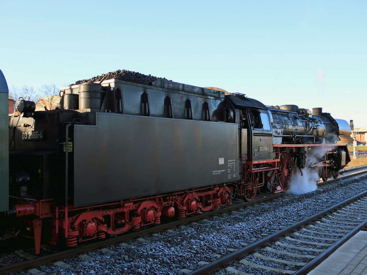 Die bei Borsig hergestellte 03 2155-4 mit einem Sonderzug aus Berlin zur Weiterfahrt nach Teilung nach Wernigerode am 03. Dezember 2016 in Halberstadt. Klaus-P. Dietrich