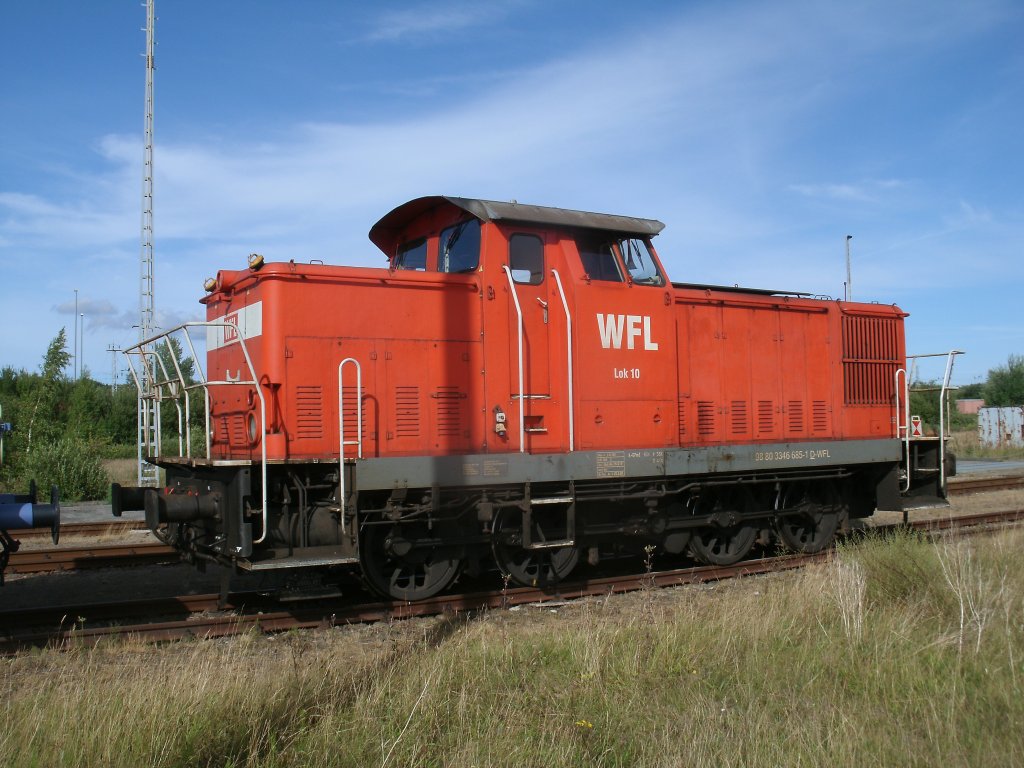 Die WFL Lok 6 wartet hier auf die Beladung des zweiten Teils des Holzzuges (Bahnhof Torgelow). Den ersten Teil des Zuges hatte sie zuvor von der Ladestrasse abgezogen und ist damit nach Pasewalk gefahren und als Tfzf zurückgekehrt. - 26.07.2013 Gerd Wiese