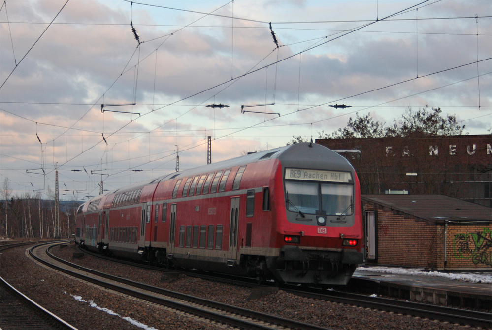 Am Schluss des RE9 mit Zuglok 111 156 hängt ein 761.2 Steuerwagen des Werks Aachen, das erkennt man u.a. daran, das das FIS defekt ist ;-) Der Zug fährt nämlich eigentlich nach Siegen oder Gießen, ab Fahrplanwechsel Dez. 2010 fährt hier die DB Regio Rheinland mit Talent 2 und Loks der BR120 + Dosto, 21.2.10 Marius Gerads