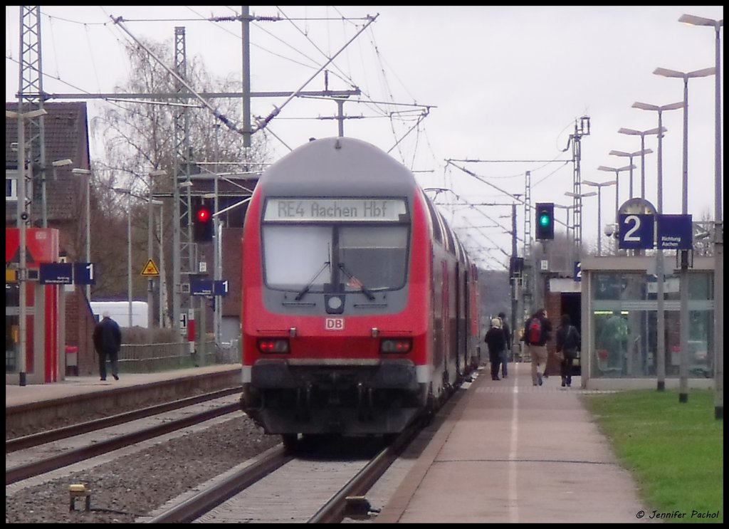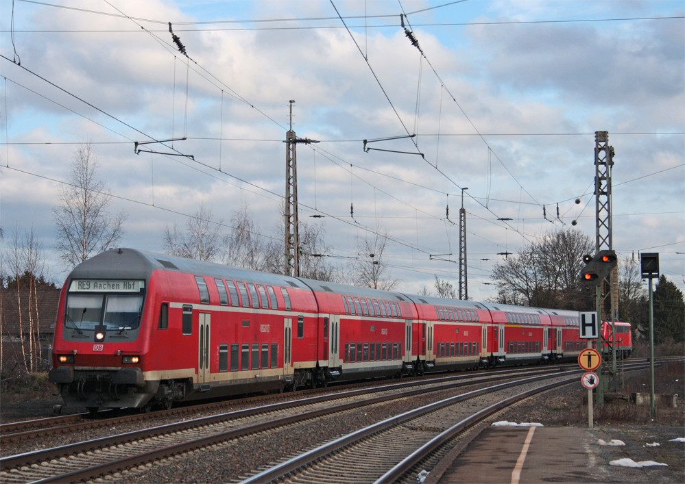 Den Steuerwagen voraus schiebt eine 111er den Doppelstockwagenzug der Linie RE4 durch den Bahnhof Korschenbroich, der ohne Halt durchfahren wird. Foto 27.2.2010 Andreas Strobel