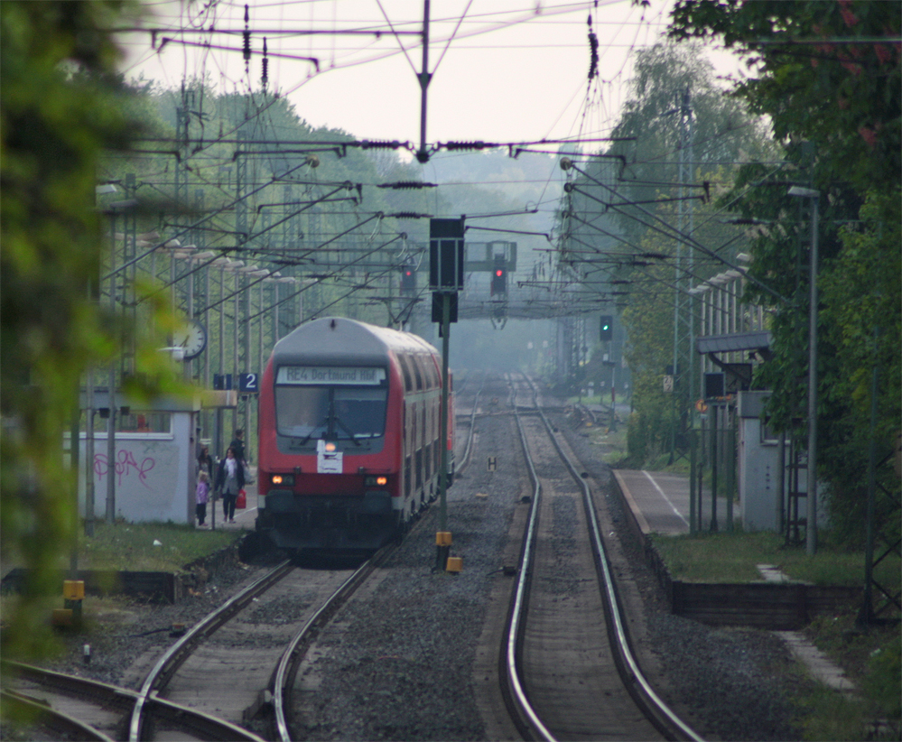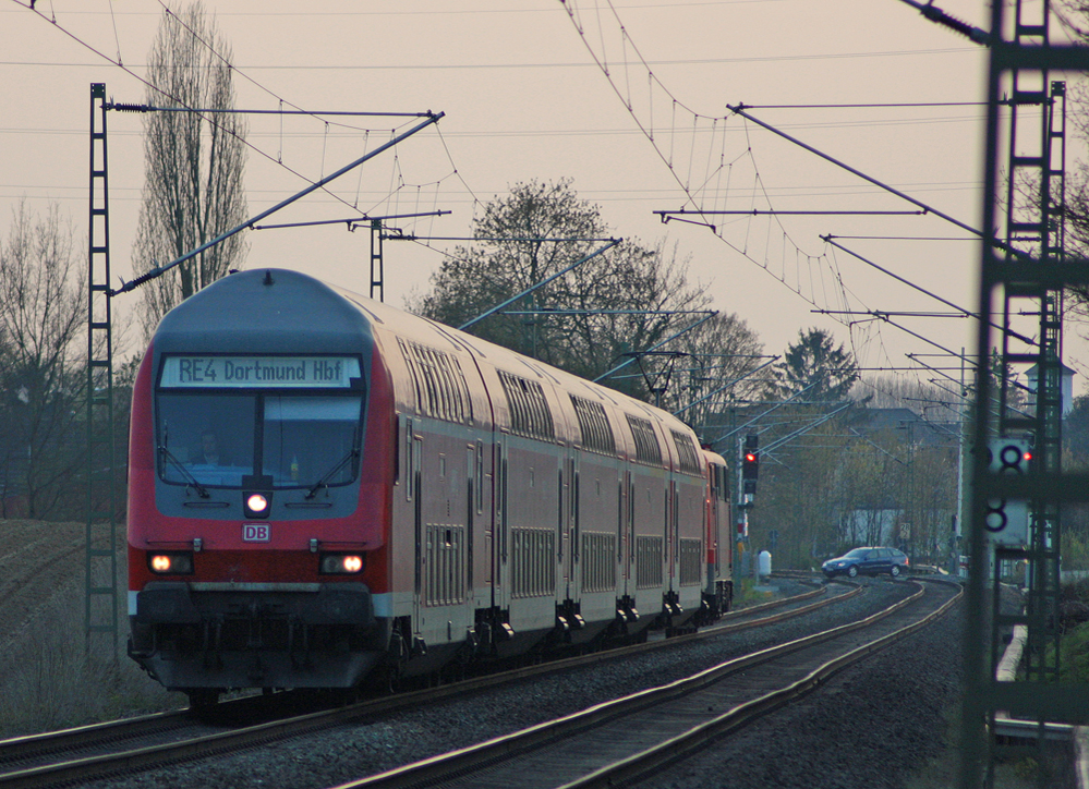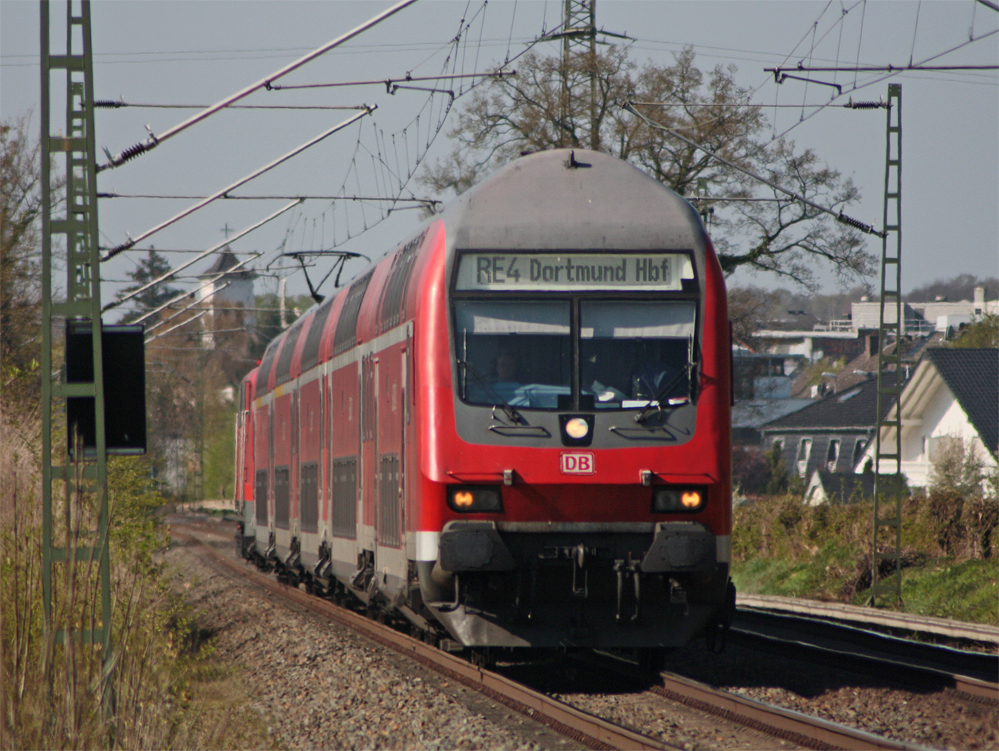 RE10410 nach Aachen (auch wenn das auf dem FIS mal wieder anders aussieht, super Wartung in Aachen!) mit Zuglok 111 154 am Km 28.8, 18.4.10 Marius Gerads