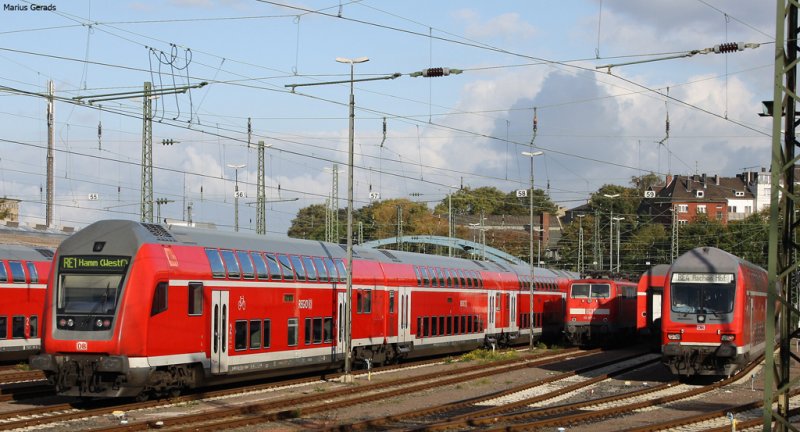 In der Abendsonne stehen die diversen in Aachen Hbf beheimateten Dosto´s vorm Wartungswerk und warten auf den Sonnenuntergang, zwischen all den Wagen verstecken sich 111 015 und 016 welche auf neue Aufgaben warten 18.10.09 Marius Gerads