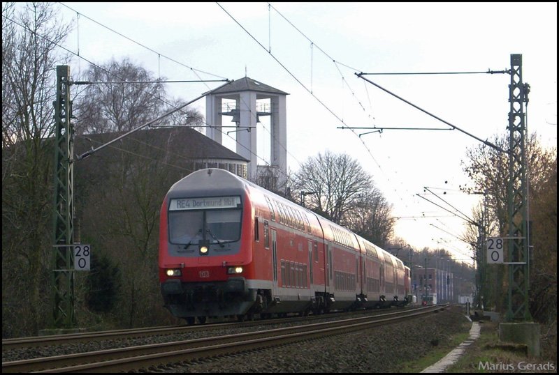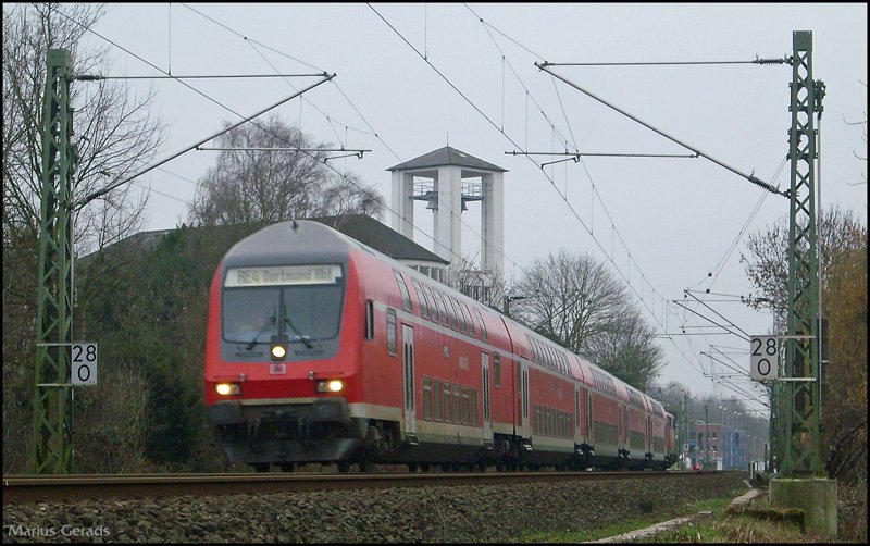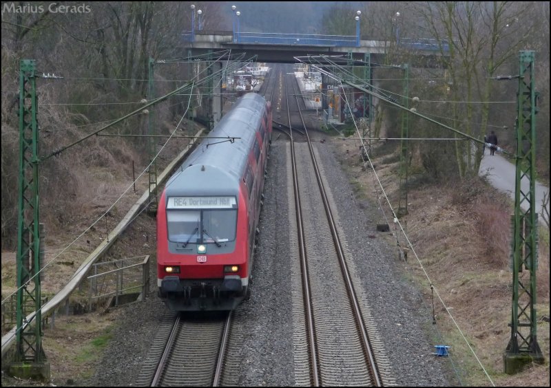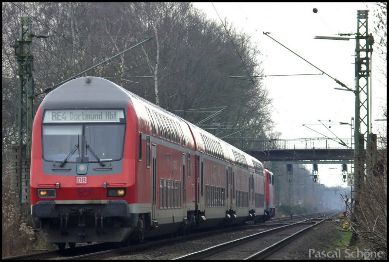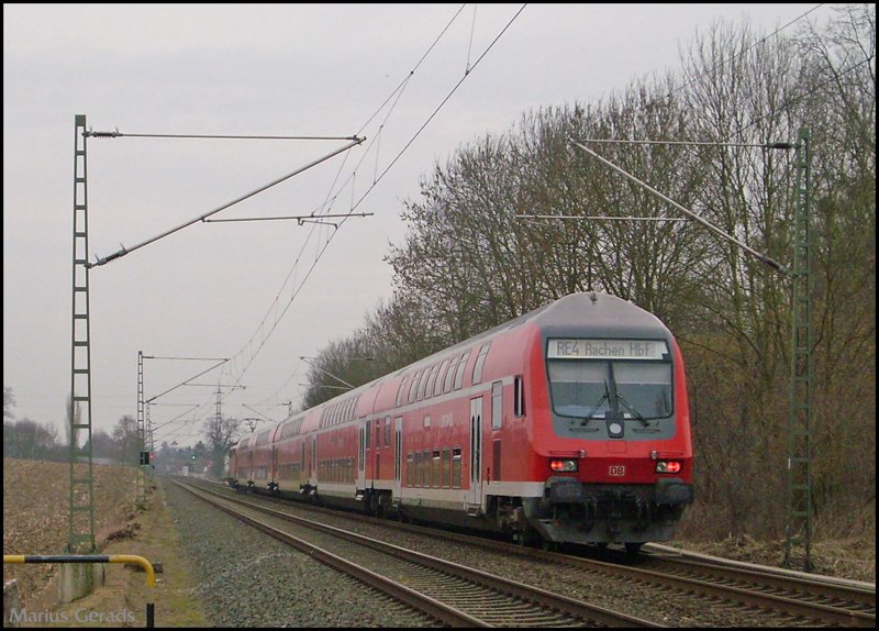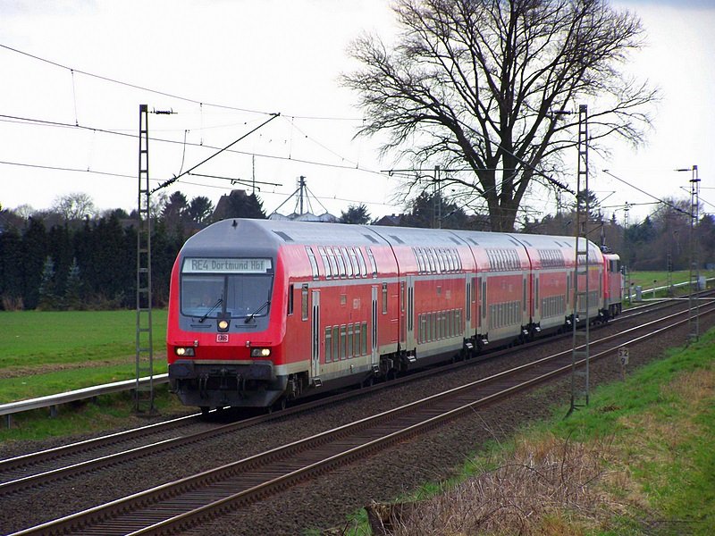 "...und da kommt er schon" Der RE10425(RE4) kommt mit 140 Km/h am Kilonmeter 52.9 der KBS485 entlang. Hier kurz hinter Herrath auf dem Weg nach Dortmund Hbf am 15.03.09 Florian Derwarf