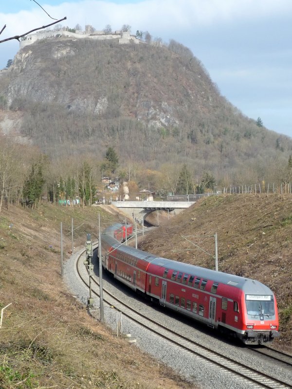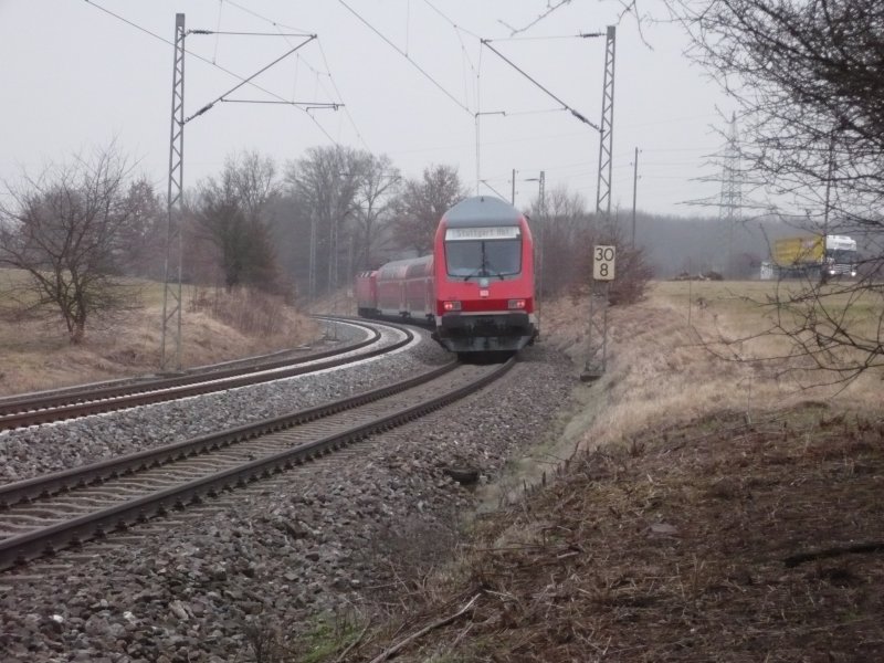 146 210-0 zieht den RE 19610 nach Stuttgart Hbf aus Singen. Ausnahmsweise mit 5 Doppelstockwagen inklusive Steuerwagen einer älteren Gattung. 15.03.09 (Falls die Kategorie nicht stimmt, lasse ich mich gern verbessern)
