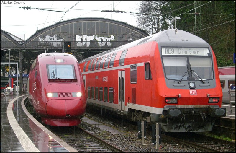 Einmal im Schnee, einmal bei schönem Wetter und nun einmal bei sch*** Wetter: Thalys nach Paris Nord und RE9 nach Gießen nebeneinander in Aachen Hbf 28.3.2009 Marius Gerads