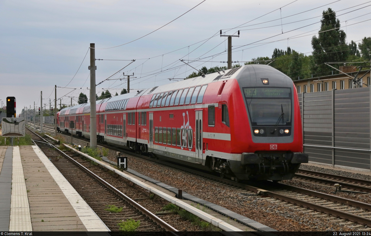 Ein Elektrotriebzug (442 843) und eine von 143 193-1 geschobene Doppelstockeinheit der DB Regio warten auf die Abfahrt. (Stralsund, August 2021) Christian Bremer