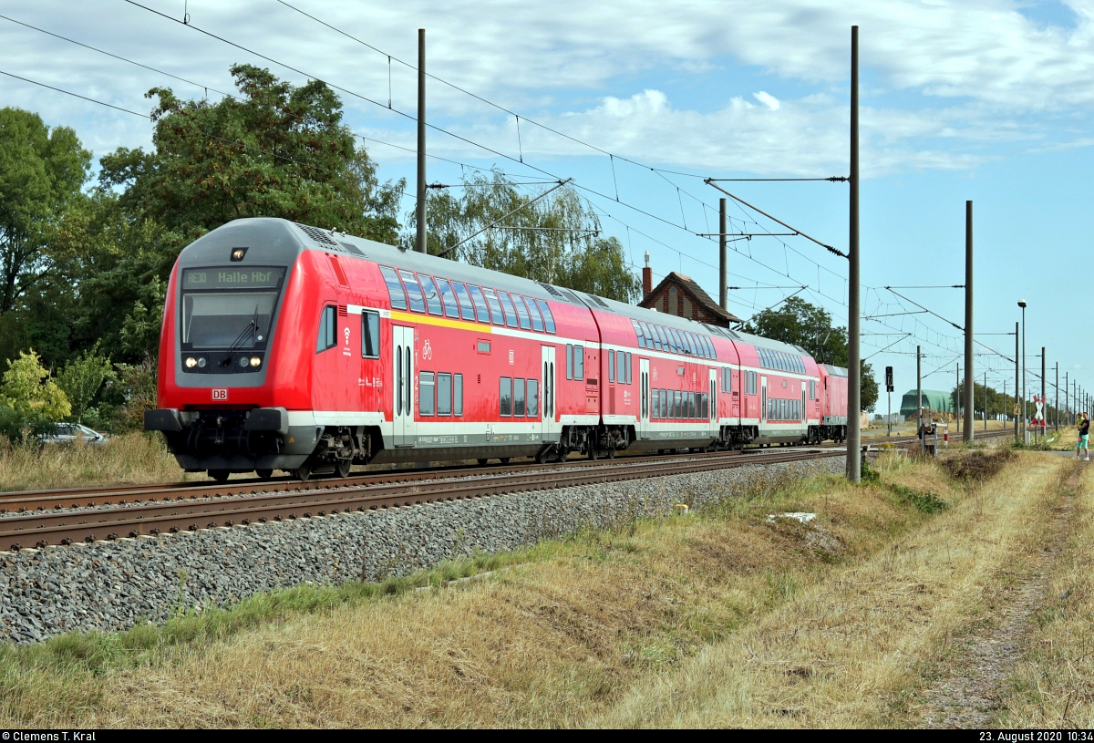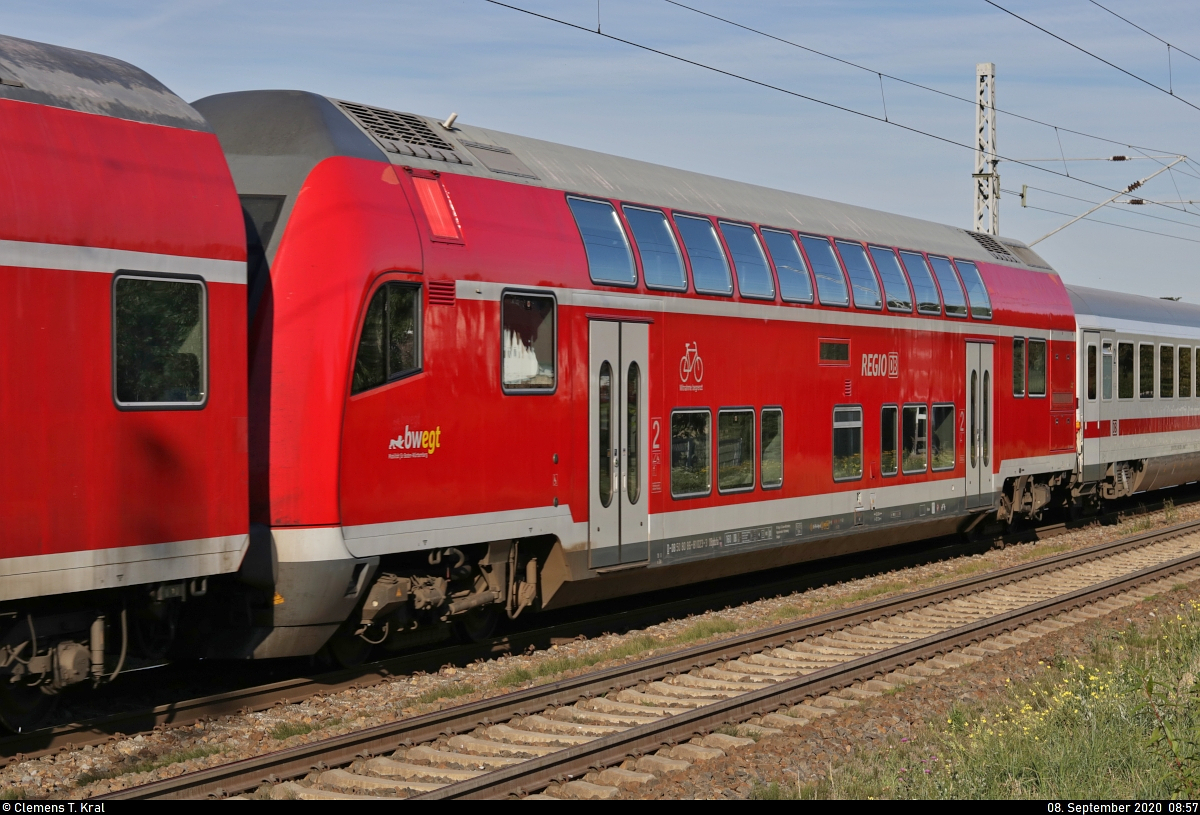 Blick auf einen Doppelstock-Steuerwagen der 2. Klasse der Gattung "DBpbzfa 766.0" (50 80 86-81 023-3 D-DB) an der Blockstelle (Bk) Zscherben.