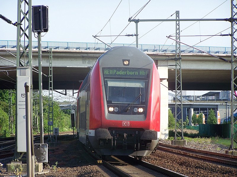 Bei schöner Abendsonne fährt der RE11 "Rhein-Hellweg-Express" von Düsseldorf Hbf nach Paderborn der nur Mo-Fr fährt, in den Flughafenbahnhof von Düsseldorf ein. 20.05.08 Florian Derwarf