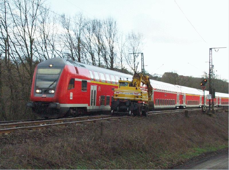 Ein Steuerwagen der Bauart DABpbzfa 764, der einzige im Bestand der DB Regio AG in Kassel, passiert mit RE 14180 auf der Fahrt von Frankfurt(Main)Hbf nach Kassel Hbf die Gleisbaustelle auf der Main-Weser-Bahn. Schublok war die Baureihe 111 086-5 (verkehrsrot).