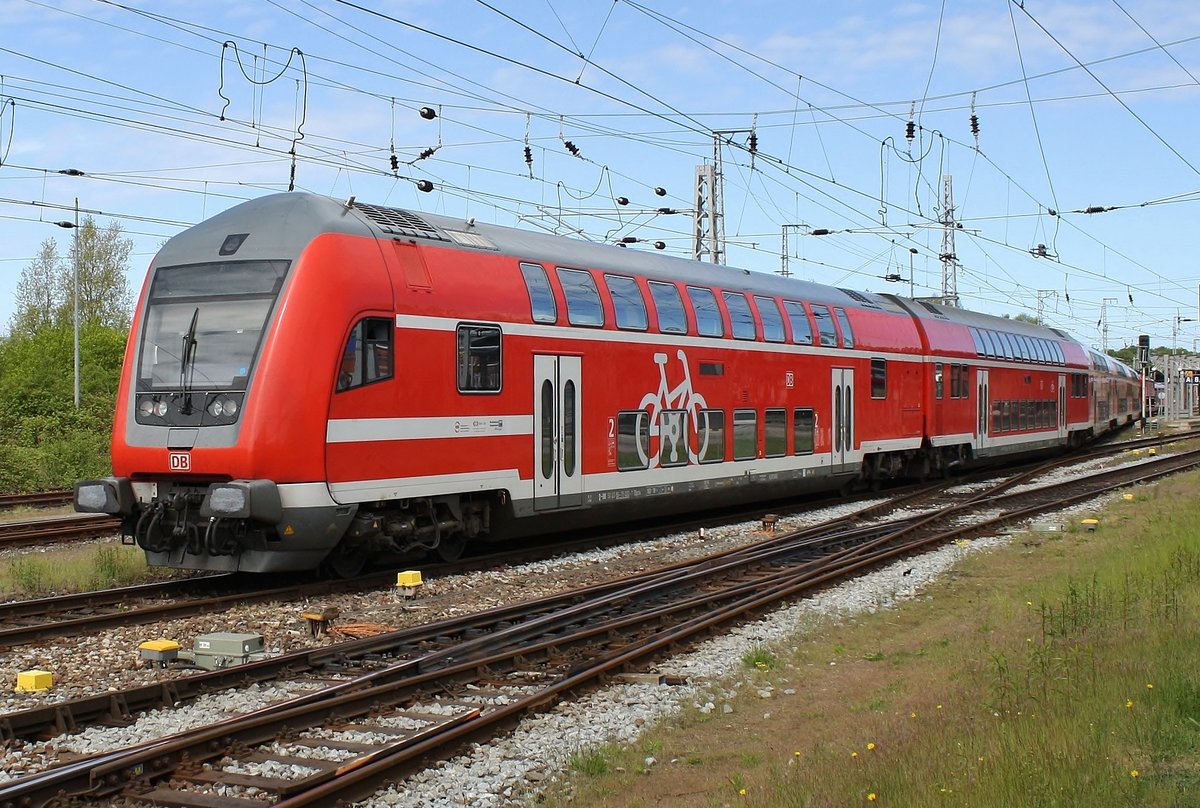 DBpbzfa mit Schublok 182 004-2 (Siemens ES64U2) von DB Regio Nordost als RE 4311 "Hanse-Express" (RE1) von Hamburg Hbf nach Rostock Hbf verlässt den Bahnhof Büchen auf Gleis 1.