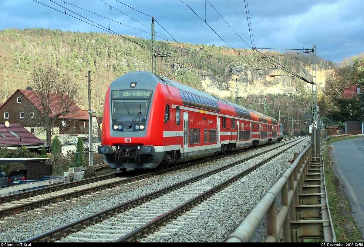 DABpbzfa mit Schublok 143 591-6 der S-Bahn Dresden (DB Regio Südost) als S 31742 (S1) von Bad Schandau nach Meißen Triebischtal erreicht am Streckenkilometer 36,9 den Hp Stadt Wehlen(Sachs) auf der Bahnstrecke Děčín–Dresden-Neustadt (Elbtalbahn | KBS 247).
