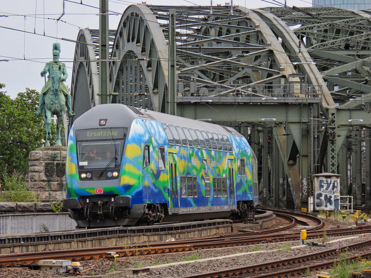 In Touristik Lackierung ist eine 4-Wagen Dosto Garnitur mit 111 074 als EM Sonderzug zwischen Dortmund und Köln unterwegs. In Köln wurde der Zug außerplanmäßig über die S-Bahnstrecke umgeleitet und fährt hier gerade von der Hohenzollernbrücke auf Gleis 11 in den Kölner Hbf ein. Viele Grüße gehen zurück an das Zugpersonal! Juni 2024 Bern hard