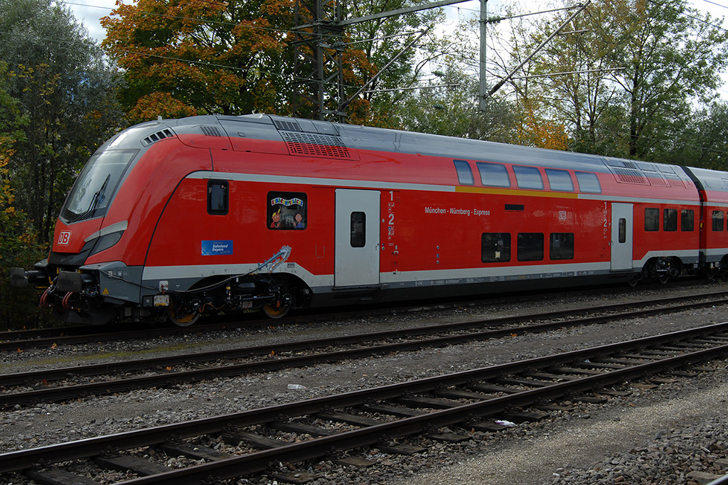 Ein Bombardier-Doppelstocksteuerwagen bildet den Zugschluss des IRE von Lindau nach Stuttgart Hbf (am 19.08.2017 beim Bahnübergang Gleisdreieck / Aeschacher Ufer, Lindau-Aeschach) Georg Friebe