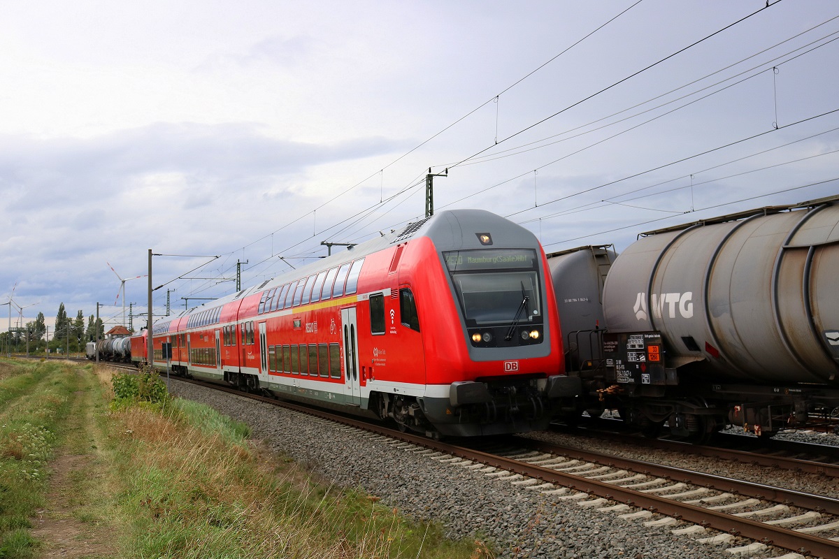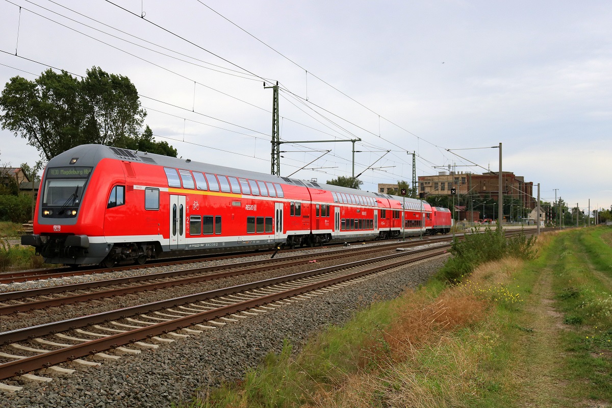 DABpbzfa mit Schublok 146 031 der Elbe-Saale-Bahn (DB Regio Südost) als RE 16320 (RE30) von Naumburg(Saale)Hbf nach Magdeburg Hbf fährt in Niemberg auf der Bahnstrecke Magdeburg–Leipzig (KBS 340). [9.9.2017 | 13:29 Uhr] Clemens Kral