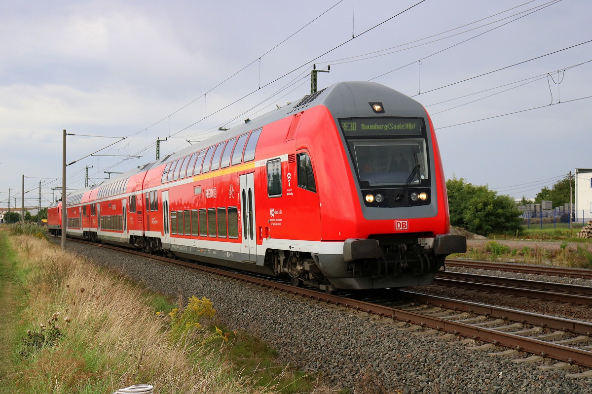 DABpbzfa mit Schublok 146 023 der Elbe-Saale-Bahn (DB Regio Südost) als RE 16321 (RE30) von Magdeburg Hbf nach Naumburg(Saale)Hbf fährt in Niemberg auf der Bahnstrecke Magdeburg–Leipzig (KBS 340). [9.9.2017 | 13:36 Uhr] Clemens Kral