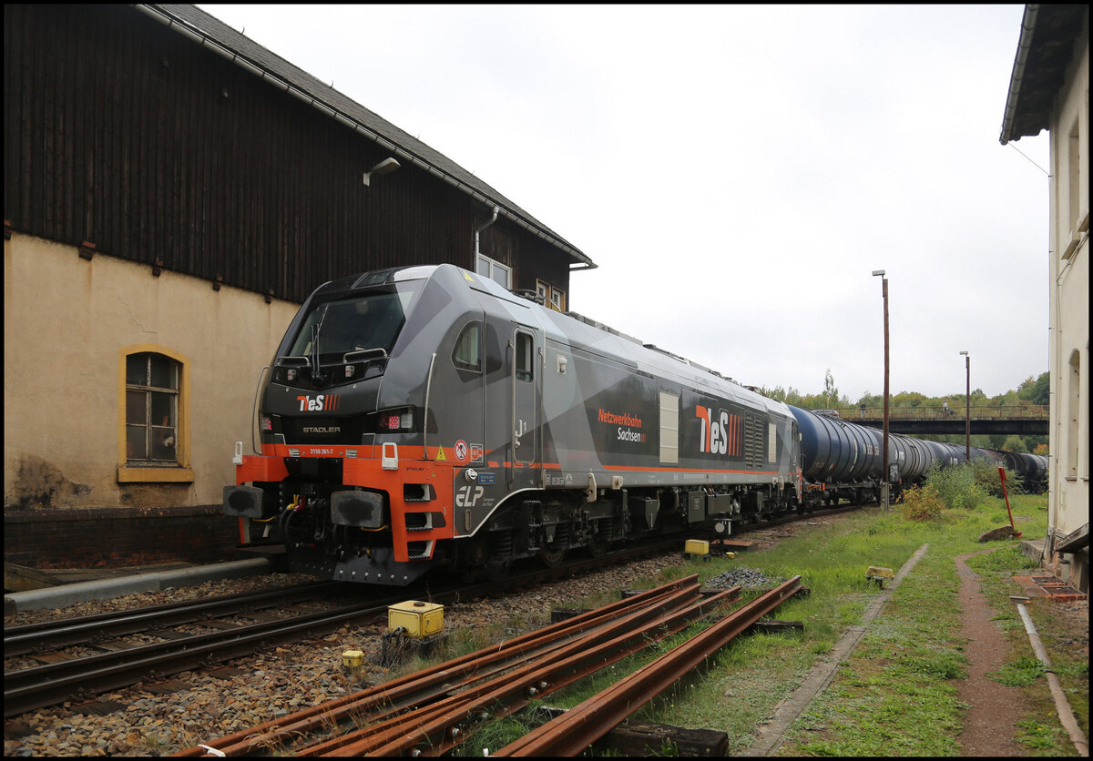 Am 6.10.2025 bekam das Tanklager bei Nossen Nachschub. Im wahrsten Sinne des Wortes schob die Eurodual RCM 159261-7 um 14.09 Uhr den schweren Zug beim Verlassen des Bahnhof Nossen nach. Zuglok war in dieser Richtung die V106886-5.