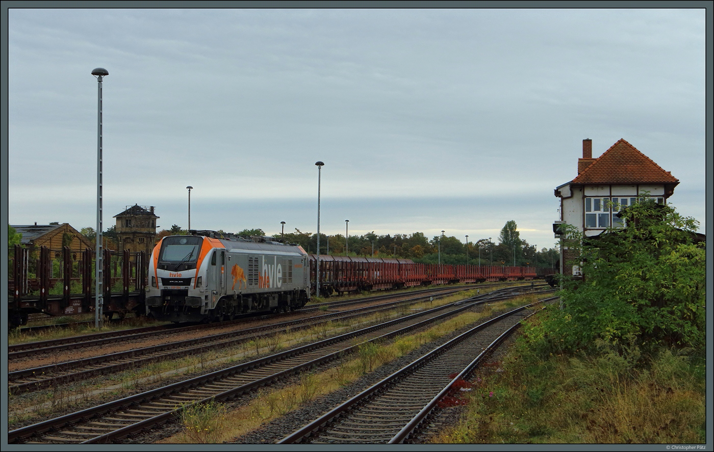 Direkt am Stellwerk B 2 in Bernburg steht am 04.10.2025 die Eurodual 159 004 der HVLE.
