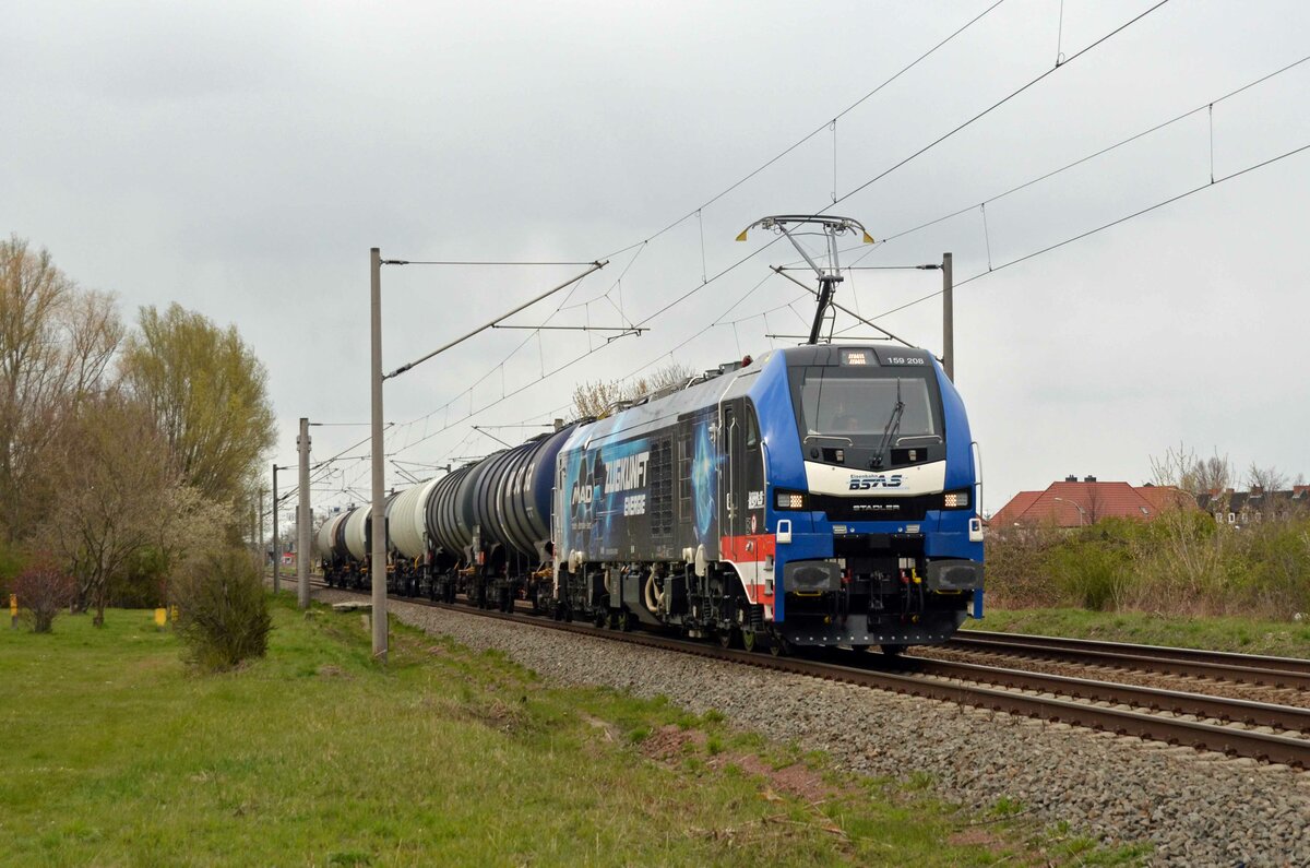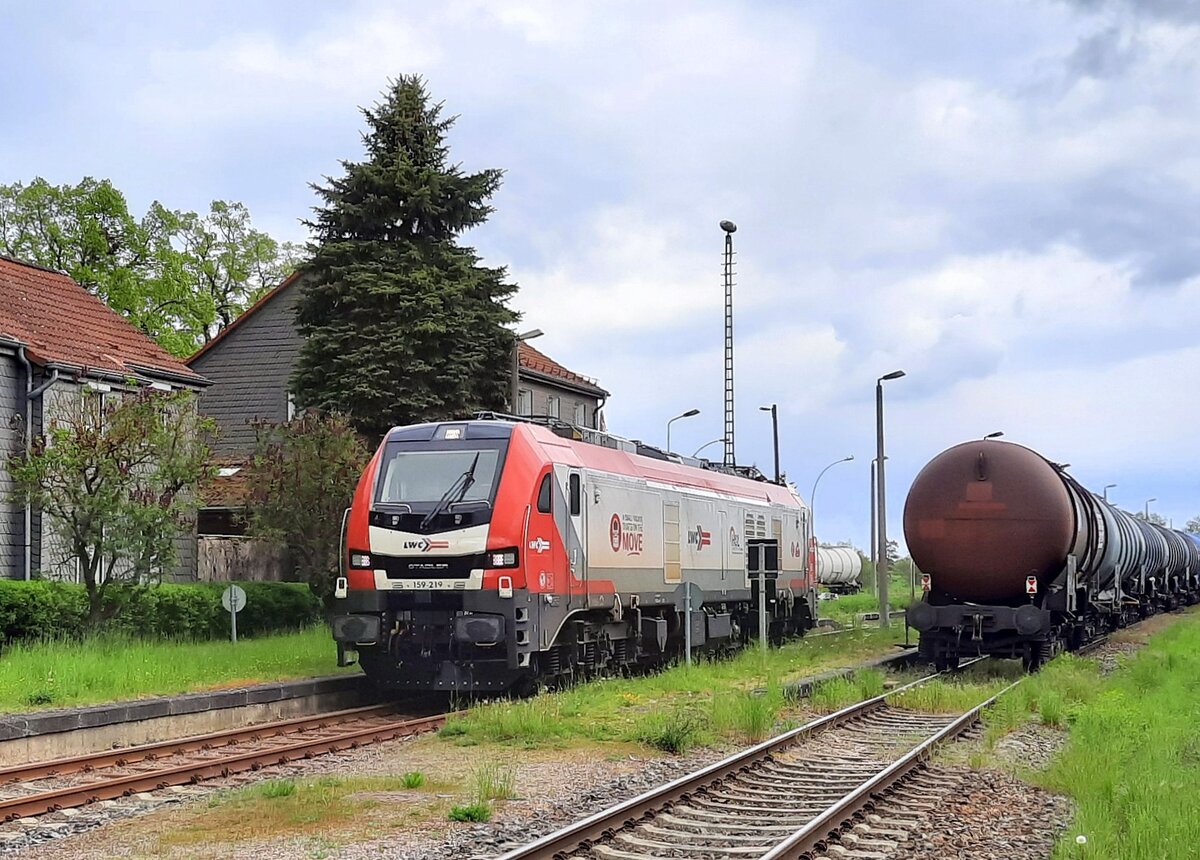 159 225 der MEG schleppte am 09.05.21 neben einer Wagenlok auch den leeren Zementzug von Regensburg nach Rüdersdorf durch Burgkemnitz Richtung Wittenberg. Martin Schneider
