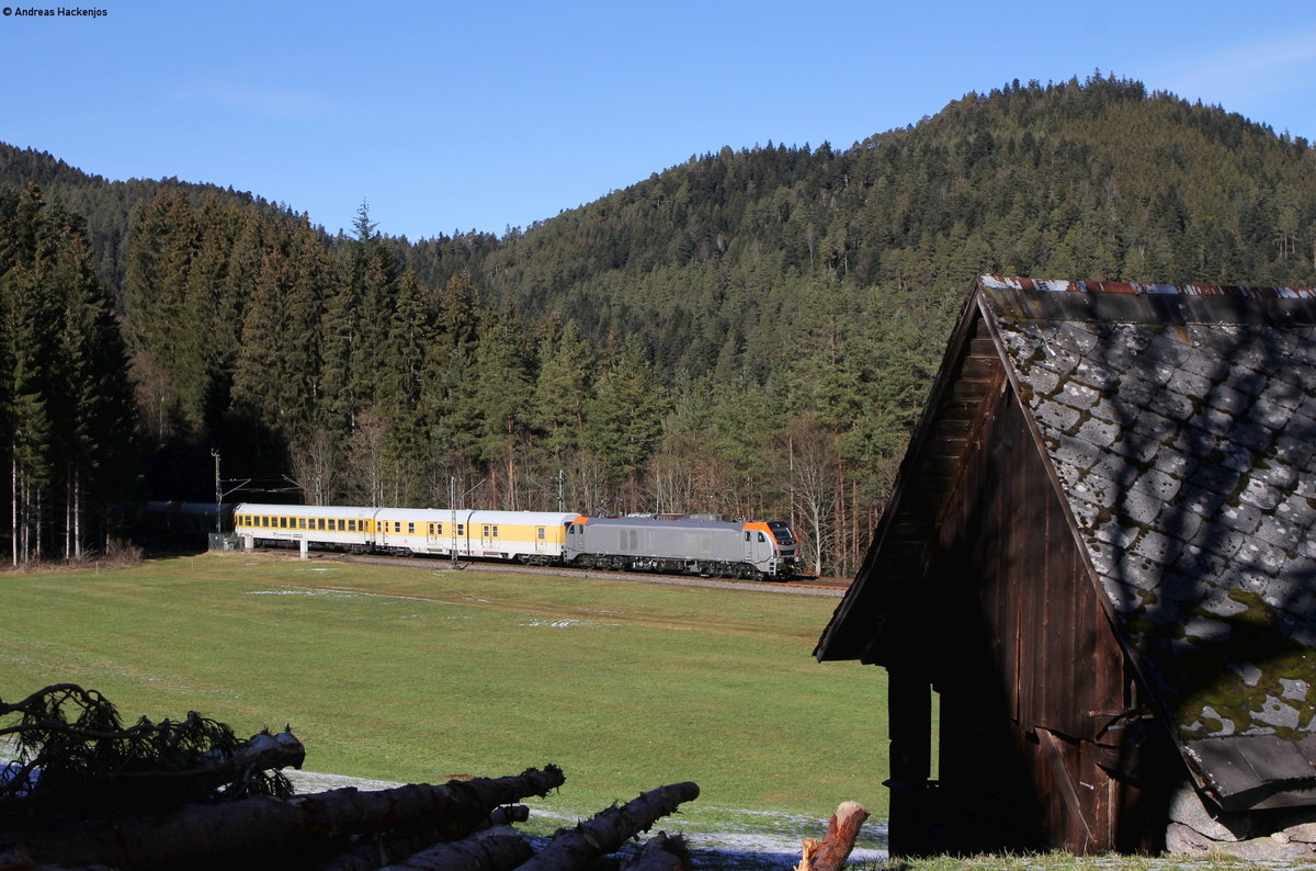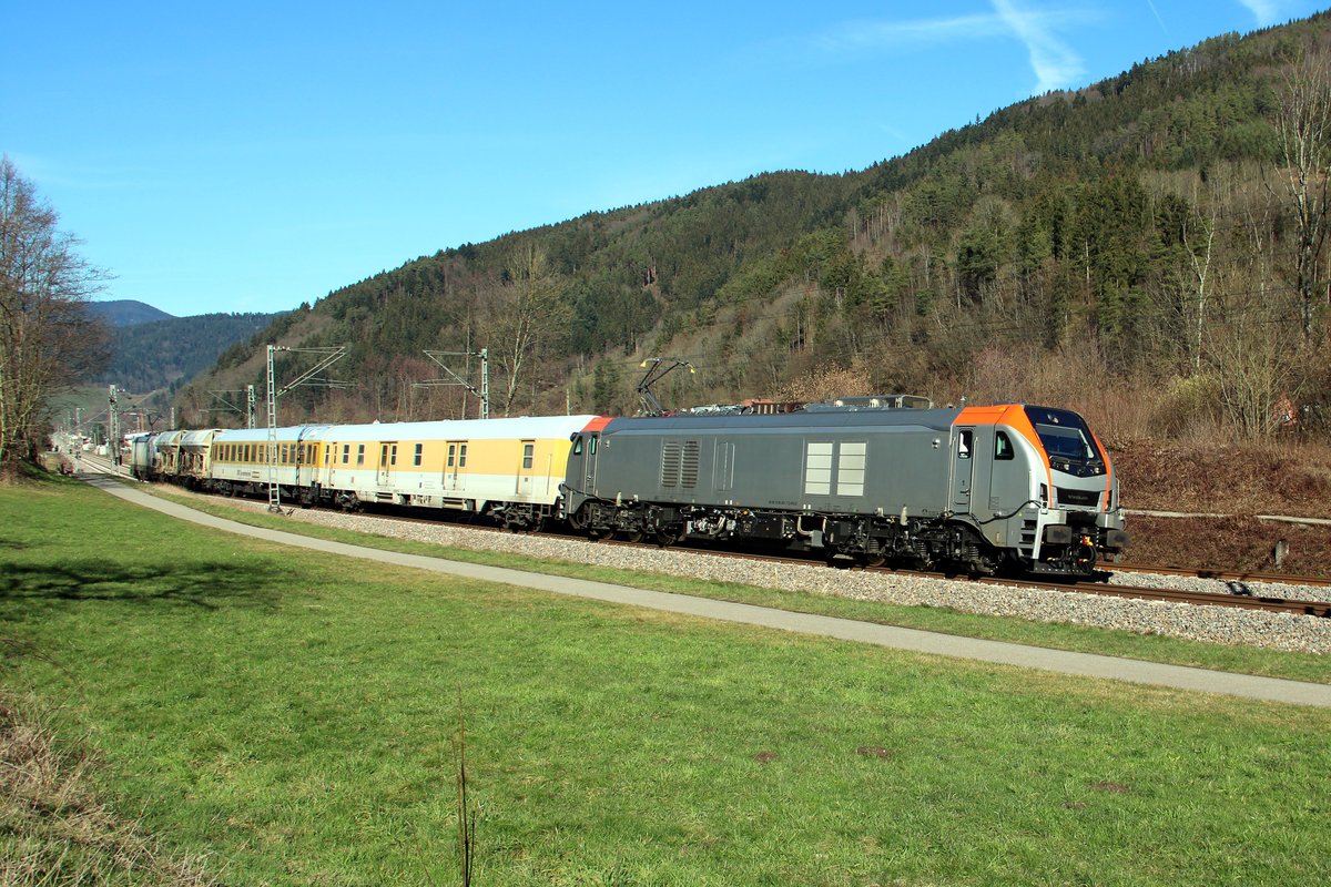Der Grund für den Ausflug in die Kälte war der ST 92082 mit 159 001-7 und Schublok 193 247-4, der bei Ohlsbach Fotografen mit -10 vorbeizog (14.02.2019) Sascha Wölfle
