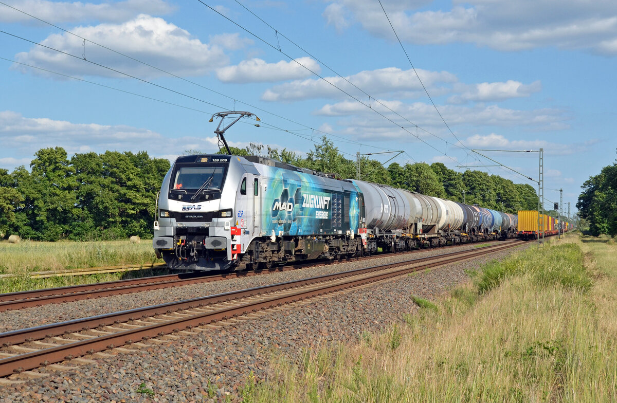 159 209 der BSAS schleppte am 19.06.25 einen Kesselwagenzug durch Jütrichau Richtung Magdeburg und begegnete dabei einem DB-Containerzug welcher Richtung Roßlau unterwegs war. Martin Schneider