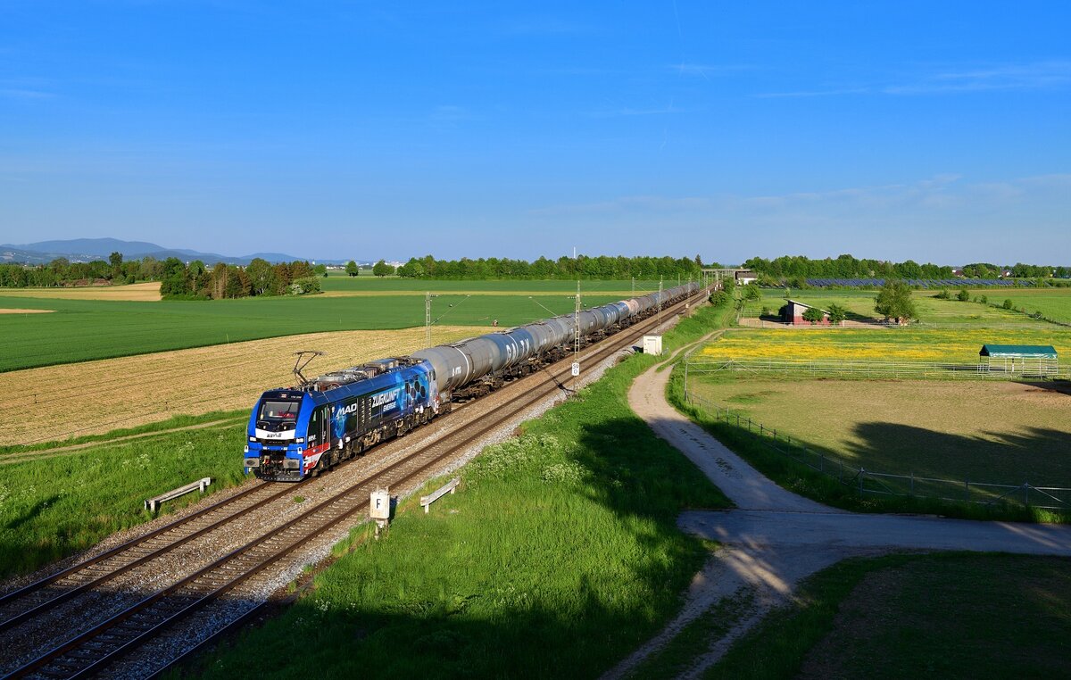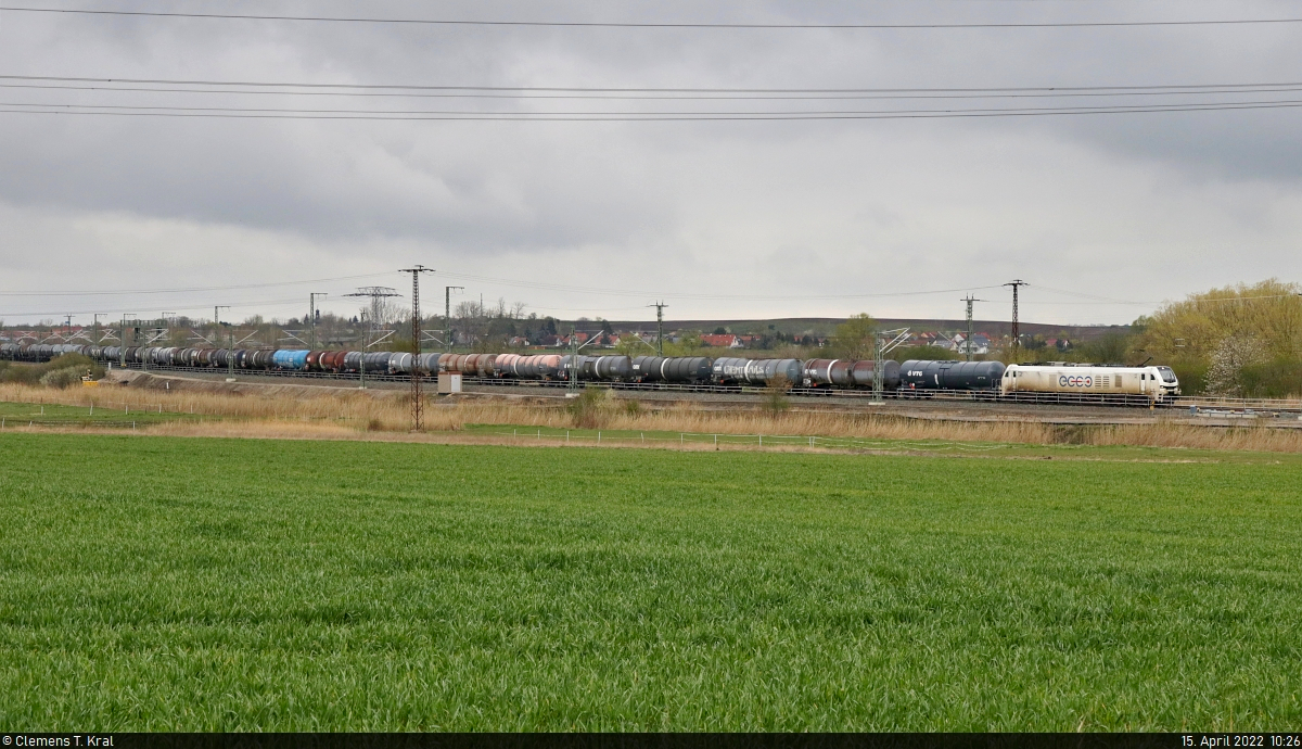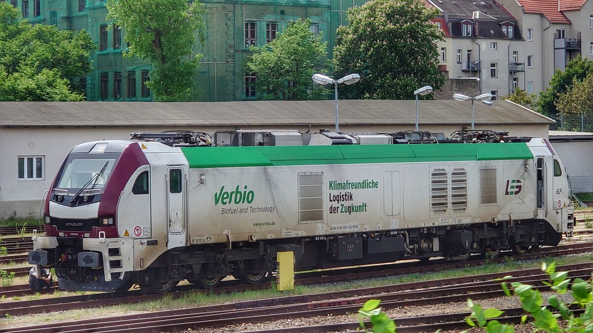 Etwas unterschätzt wurde die Länge dieses Kesselzuges, der letztlich nicht in den Bildausschnitt passte. Mit 159 214-6 (Stadler Eurodual) ist er parallel zum Angersdorfer Roßgraben Richtung Halle (Saale) unterwegs.