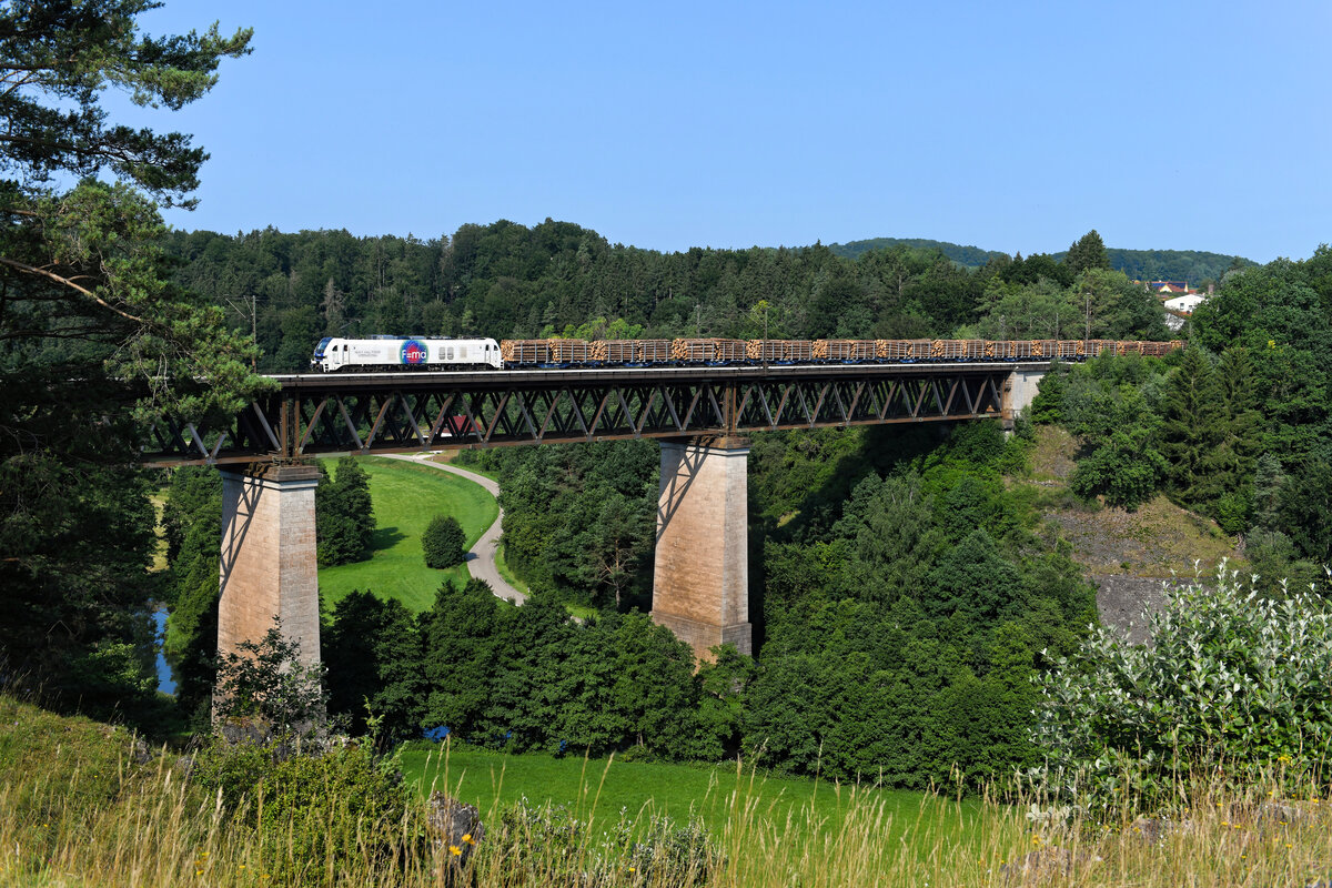 Die Eisenbahnbrücke Beratzhausen über die Schwarze Laber ist mit einer Länge von 180 Metern und einer Höhe von 42 Metern die vierthöchste Eisenbahnbrücke Bayerns. Am 23. Juli 2021 konnte ich die für HHPI fahrende Euro Dual 159 201 vor dem Holzzug DGS 60927 von Kreiensen nach Plattling beim Überqueren des eindrucksvollen Bauwerks fotografieren. Christoph Schneider