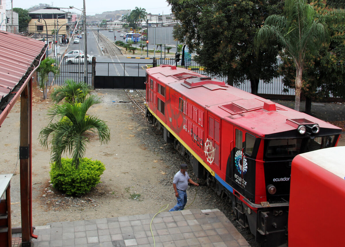 Vorbereitungsarbeiten vor der Abfahrt: Ein halbe Stunde vor der Abfahrt unseres Charterzuges wird hier der Touristenzug von Guayaquil nach Bucay bereit gemacht. Das Tor in den Bahnhof ist noch geschlossen und wird erst kurz vor der Zugsabfahrt geöffnet. Guayaquil, 04.08.2018 Markus Gmür