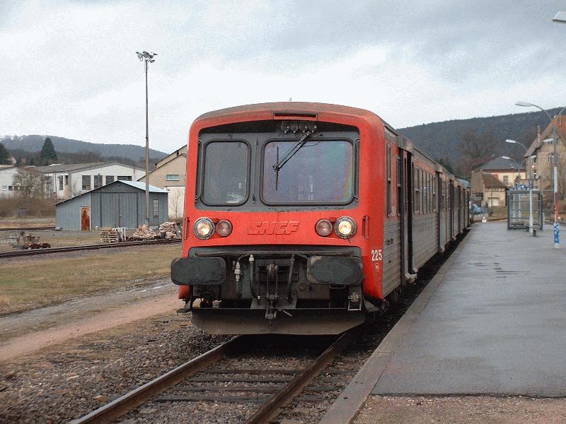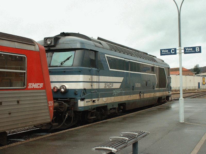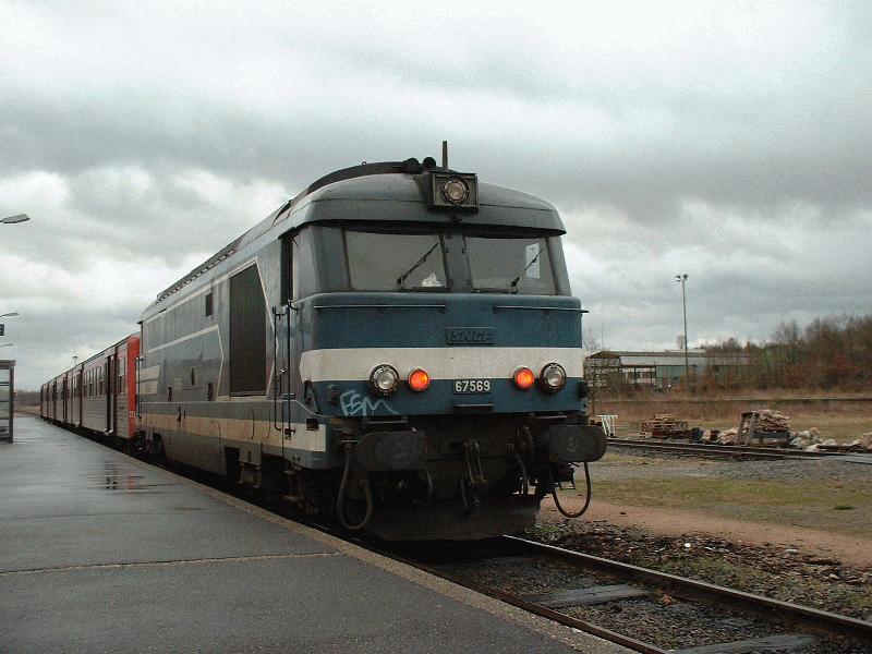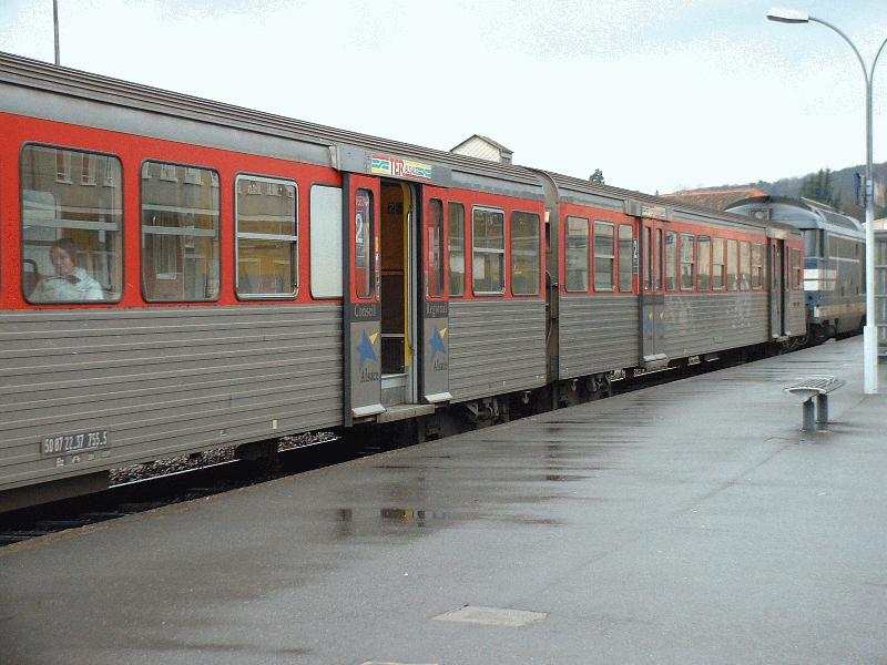 Wendezug mit Diesellok 5 67 411 (am hinteren Zugende) am 22.05.2003 in Lauterbourg / Elsaß. Rechts ein Autotransportzug mit Neu-Wagen, der vermutlich aus Deutschland gekommen ist, er fuhr kurze Zeit später mit der Diesellok 4 63 874 weiter in Richtung Strasbourg. Links ein DB-Triebzug BR 628, er kommt etwa im Stundentakt von Wörth. Günther Glauz
