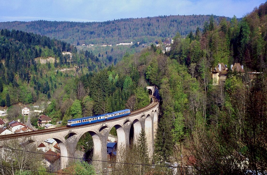 Der (ex) SNCF X ABD 2816 ist im Rahmen einer Ostersonderfahrt beim den kleinen Weiler Pont de la Roche unterwegs. Der Dieseltriebwagen gehört der "Assosiation l'autrail X2800 du Haut Doubs". Der mitgeführte aber wenig passende Beiwagen wurde für dieses Foto "entfernt". Die Die schöne Strecke beginnt in Besançon, welches am Doubs liegt, auf 218 müM, führt quer durchs Land, erreicht kurz nach Gilly den noch jungen Doubs und in Le Locle mit 946 müM den Kulminationspunkt.