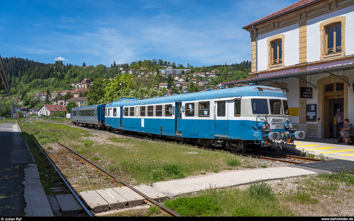 Der SNCF X 2816 und dahinter versteckt der X 2869 sind von Dôle Ville nach St-Claude unterwegs und sind nun in Morez angekommen, wo der Zug die Fahrtrichtung wechselt.
