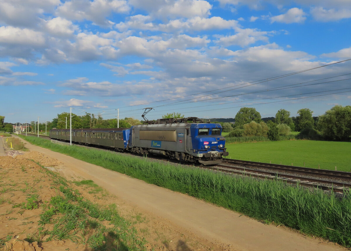 SNCF 22305 schiebt ein TER nach Selestat aus Strasbourg am 24 Juni 2024.
