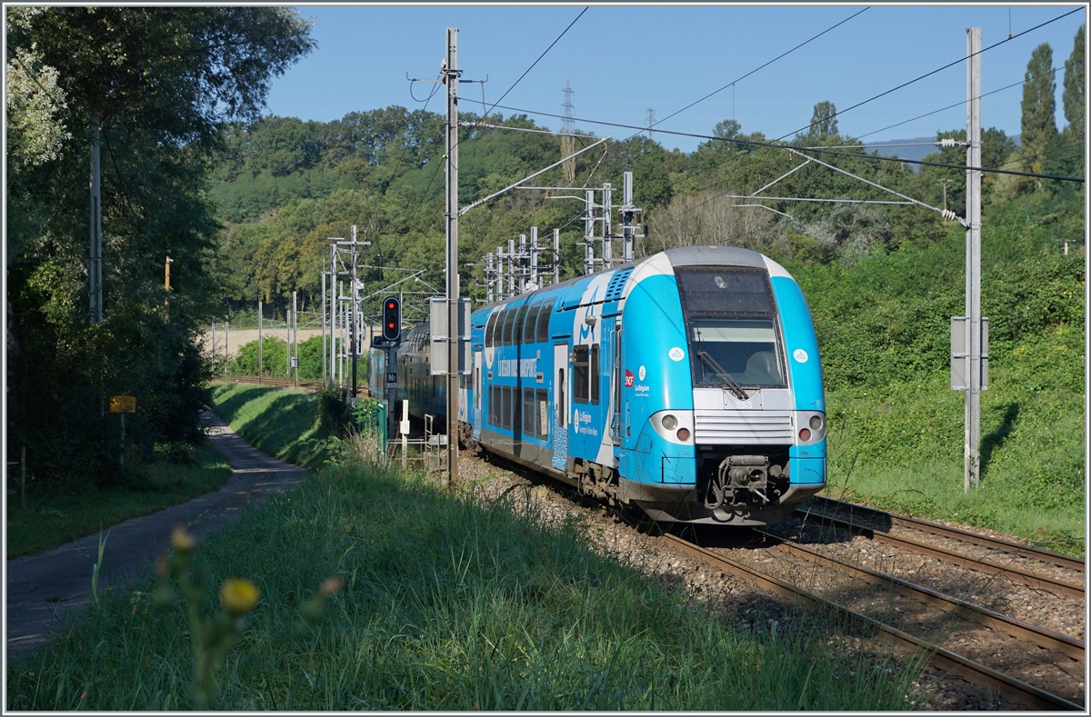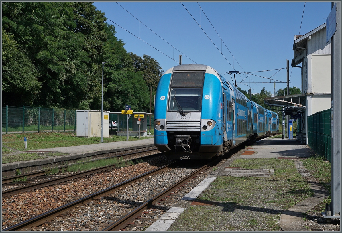 Alle die vielen gezeigten Lok können nicht über die Tatsache hinwegtäuschen, dass auch ein Frankreich vorwiegend Triebzüge das Betriebsgeschehen bestimmen. Kurz nach La Plaine ist der   SNCF Doppelstocktriebzug Z 243538  Computermouse  im freundlichen Auvergne-Rhône-Alpes Himmelblau als TER von Genève nach Grenoble unterwegs.