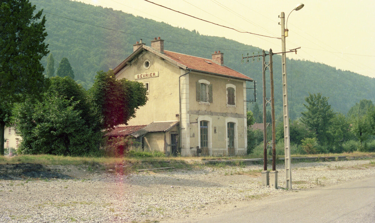 Blick auf den Bahnhof Sévrier an der ehemaligen Strecke Albertville - Annecy. Als ich den verlassenen Bahnhof am 28.07.1975 vorfand sah alles noch ziemlich original aus. Den genauen Standpunkt finde ich auf der aktuellen Karte nicht mehr, so das ich diesmal keine Geoposition setzten kann. Es war jedenfalls nördlich vom Campingplatz im Dorf. Scanbild 90461, KodacolorII.