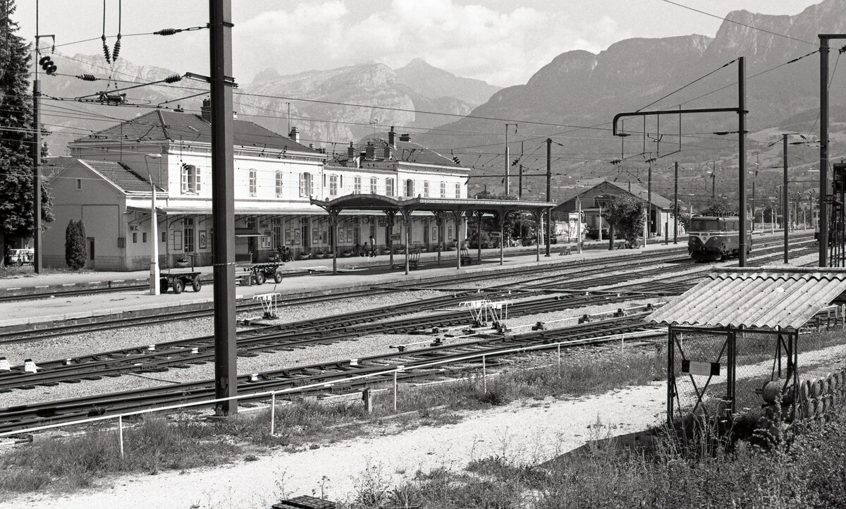 Historisches Bild vom Bahnhof La Roche-sur-Foron am 02.08.1976. Bahnhofsgebäude und Bahnsteigüberdachung stammen noch aus der PLM-Zeit. Im Hintergrund der Güterschuppen. Rechts wartet SNCF CC25008. Scanbild 90782, Kodak Plus Xpan.
