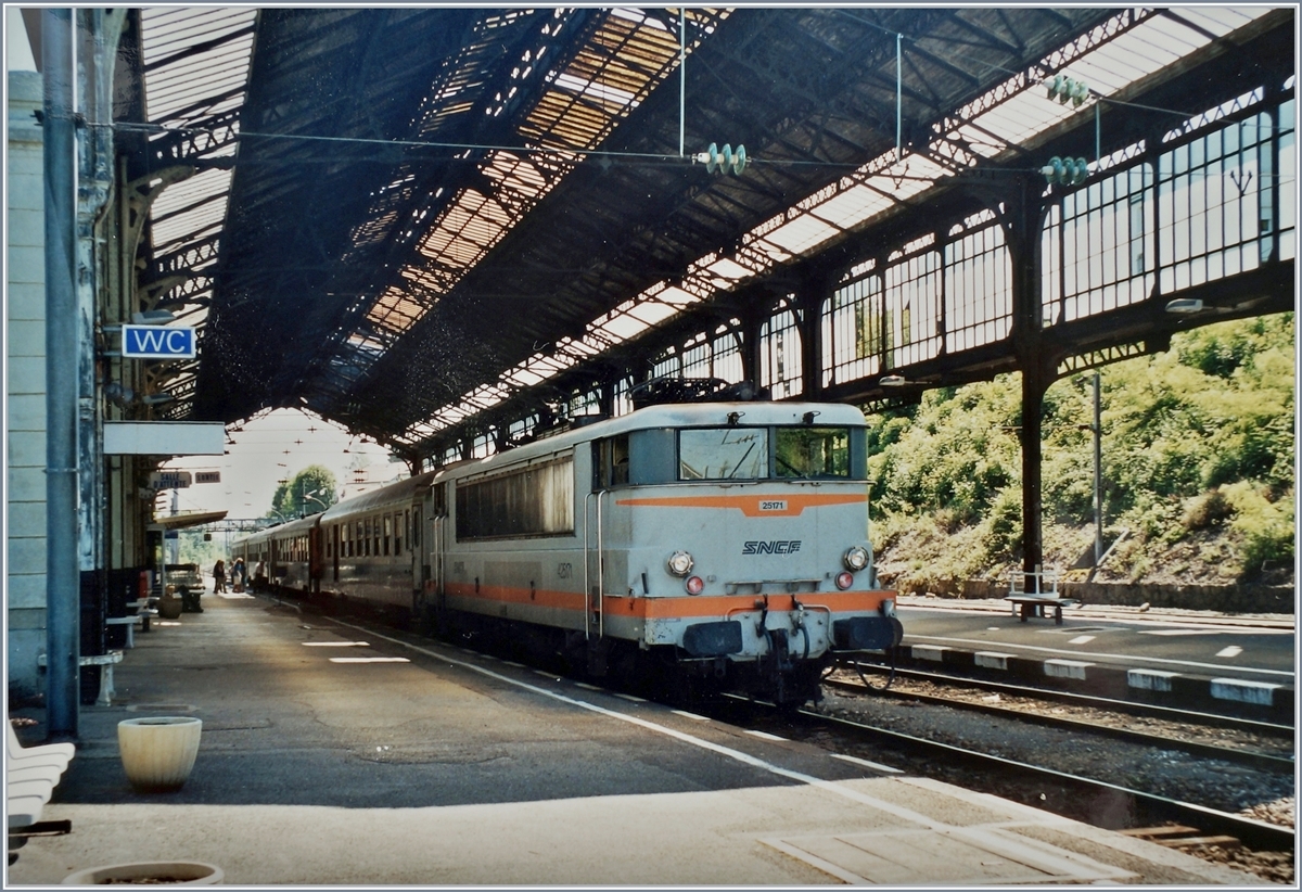 In Evian Les Bains wartet die SNCF BB 25171 mit einem bunt gemischten TER auf die Abfahrt nach Bellegarde. Analogbild vom Juli 2001