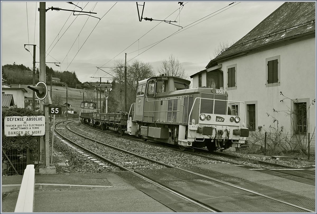 Noch eine SNCF Lok, bzw. gleich zwei, die als Locotracteur bezeichneter SNCF Y 8507 (und eine weitere am Zugsschluss) sind bei Groisy-Thorens-La Caille auf dem Weg von La Roche-sur-Foron nach Annecy. 13. Februar 2020