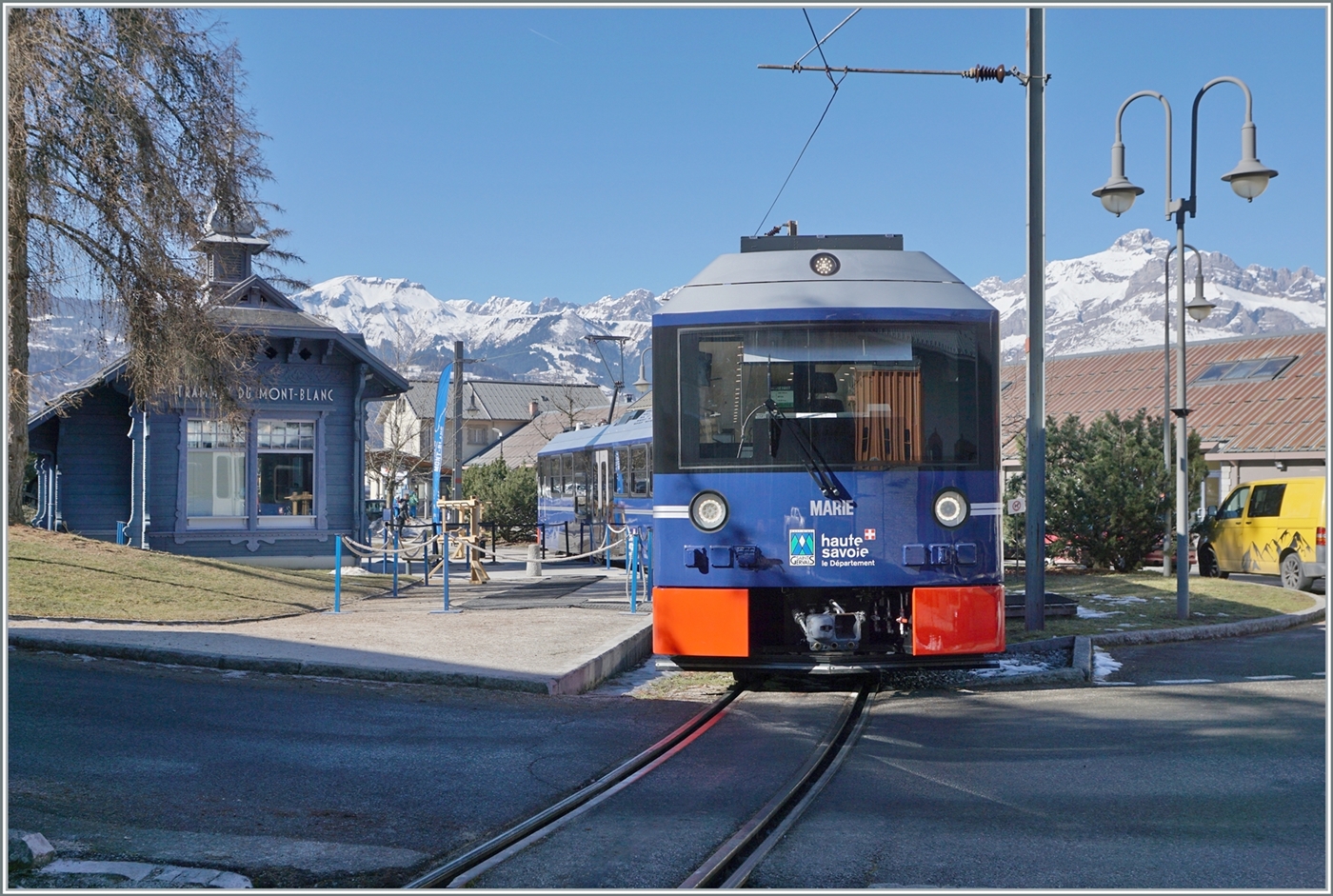 Auf dem Bahnhofsplatz von Saint Germain-Les-Bains-le-Fayet wartet der Tramway du Montblanc (TMB) Triebwagenzug "Marie" mit passendem Steuerwagen auf die baldige Bergfahrt in Richtung Nid d'Aigle. Interessanterweise ist es kaum möglich in Frankreich bei etlichen Schmalspurbahnen die "offizielle" Bezeichnung der Fahrzeuge zu erhalten und dies selbst bei Neubaufahrzeugen wie die "Marie". 14. Februar 2023