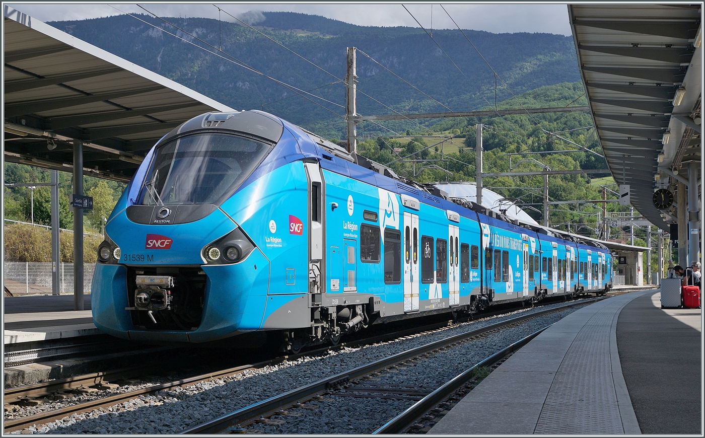 Der SNCF Coradia Polyvalent régional tricourant Z 31539M ist als TER 8845162 von Evian-les-Bains kommend im Bahnhof von Bellegarde-sur-Valserine am Ziel seiner Fahrt angekommen.