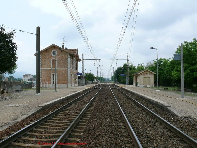 Das Bild zeigt auch, selbst wenn man etwas genauer hinschauen muss, die Funktion des Bahnhofs von Bellegarde (Ain) als  Keilbahnhof  indem im linken Bildteil der TGV Bahnsteig zu sehen ist.