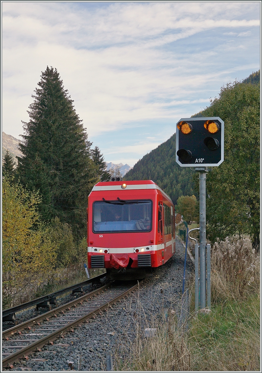 Der SNCF Z 850 055 ist als TER 18914 von Vallorcine nach St-Gervais-Les Bains-le-Fayet unterwegs und passiert kurz nach seiner Abfahrt das Einfahrvorsignal von Vallorcine A10*, welches unschwer als Schweizer Bauart zu erkennen ist.