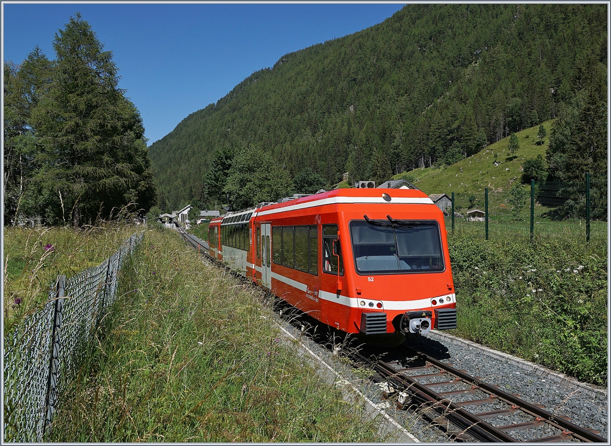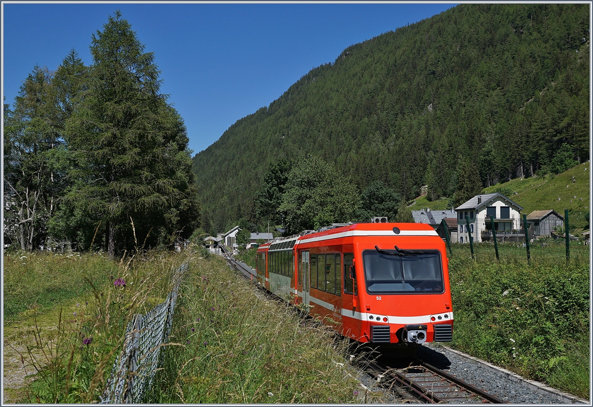 Der SNCF Z 850 N° 52 (94 87 0001 854-2F-SNCF) hat vor Kurzem den im Hintergrund zu erkennenden Bahnhof von Vallorcine verlassen und fährt nun als TER 18988 nach Les Houches.