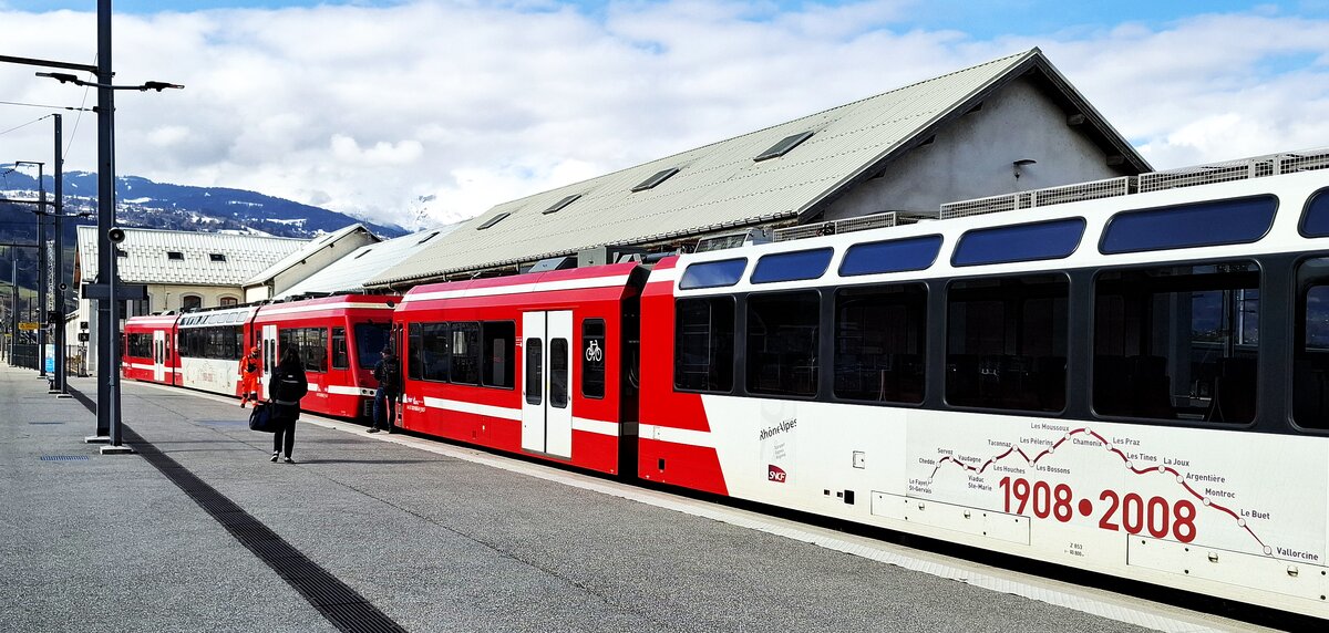 Mont-Blanc-Express__Ja, schon klar, der Zug ist "abgeschnitten", aber hier sollte der plakatierte Streckenverlauf im Vordergrund stehen. Endstation für die Meterspur : Bf Saint-Gervais-Le-Fayet mit SNCF-TER-Zug Z 850 052.__01-03-2026 Klaus-Erich Lisk