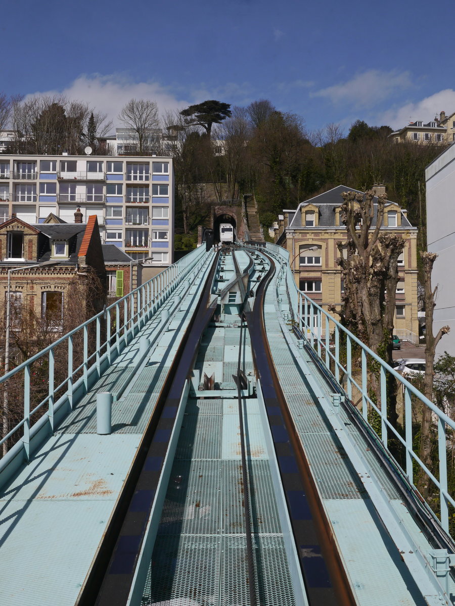 Funiculaire du Havre. Bergfahrt mit Kreuzung. Die Standseilbahn in Le Havre verbindet die Unterstadt mit den Wohngebieten auf der Hochebene. Sie ist Teil des ÖPNV-Angebots in Le Havre. Sie wurde 1890 eröffnet und 1911 elektrifiziert. Da die Bahn veraltet war, wurde sie von 1969-1972 geschlossen und als neue Bahn auf Gummirädern wieder eröffnet. Sie ist 343 Meter lang und überwindet einen Höhenunterschied von 77 Metern. Momentan ist sie seit August 2016 außer Betrieb, da Korrosionsschäden am Fahrweg behoben werden müssen. 29.03.2016 Le Havre Arnulf Sensenbrenner