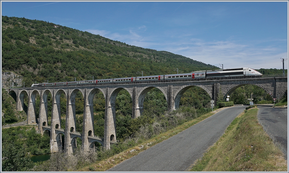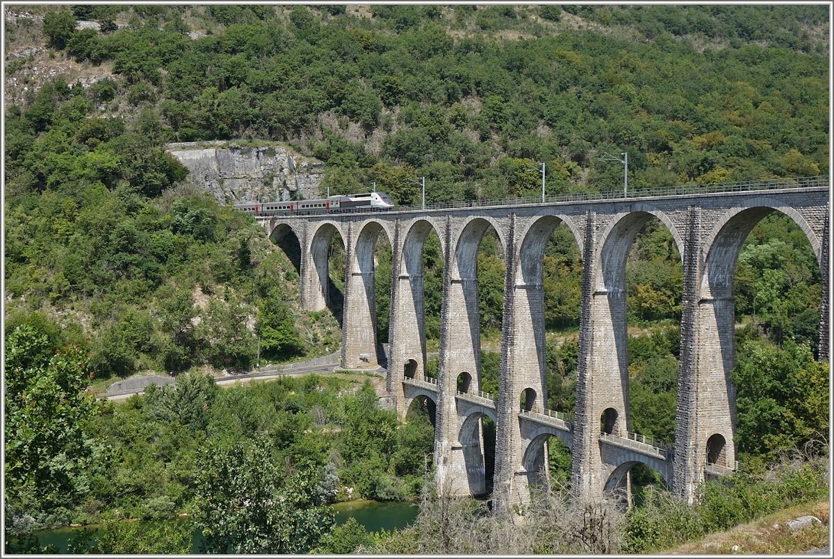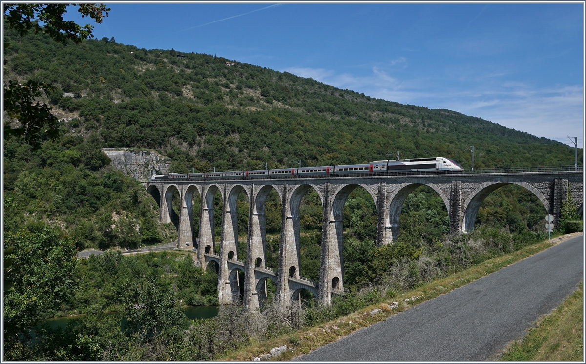 Im Bild der TGV-Triebzug 4401 als TGV Lyria 9770 von Genève nach Paris auf dem 269 Meter langen Viaduc de Cize-Bolozon welches die Ain überbrückt.
