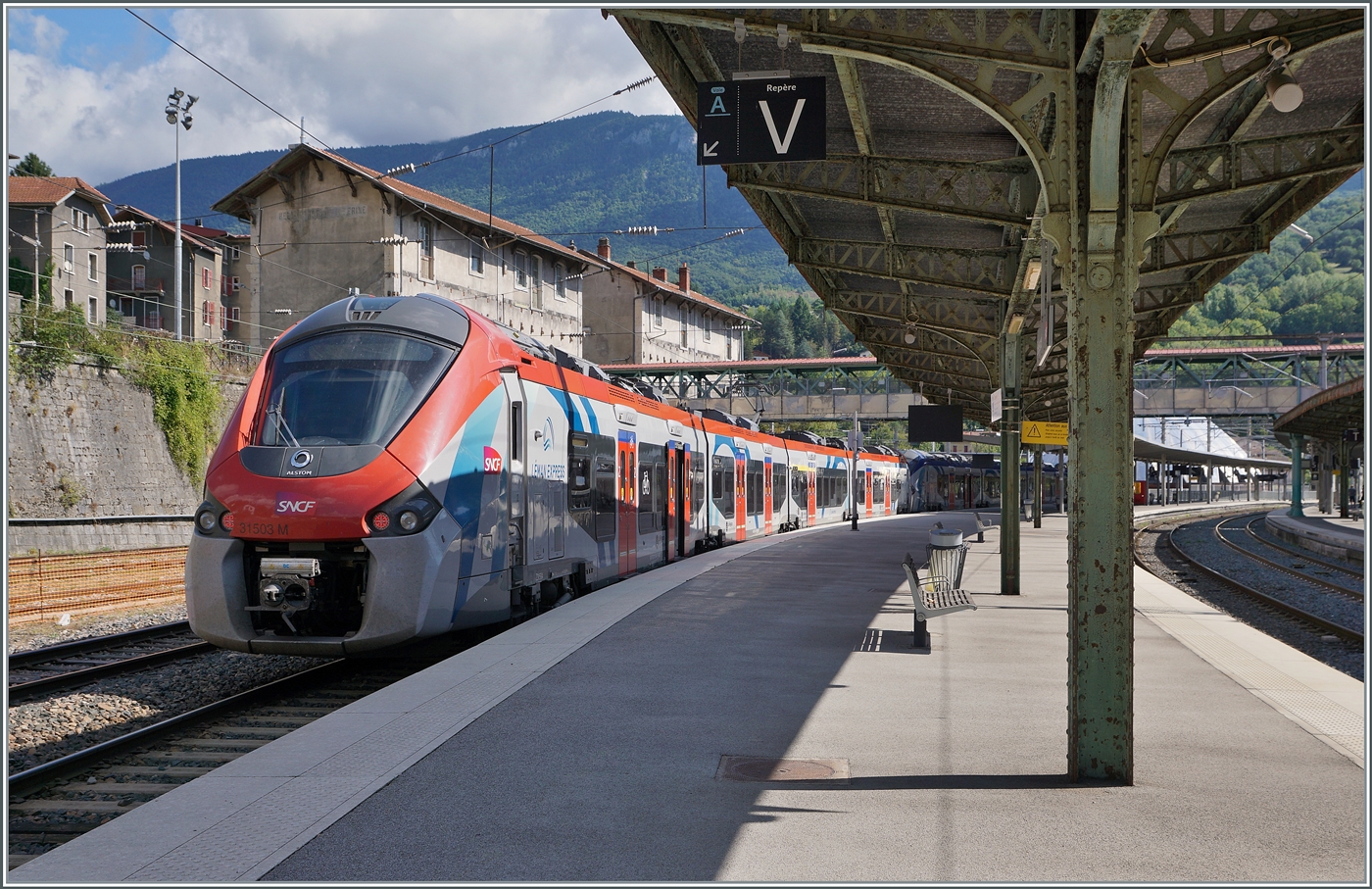 Soweit zum Motiv des Bildes; nun noch en paar Worte zum Zug, der hübsch den Hintergrund ziert.: Der SNCF Coradia Polyvalent régional tricourant Z 31 503M (und ein weiterer) warten in Bellegarde auf die Abfahrt nach Evian Les Bains.