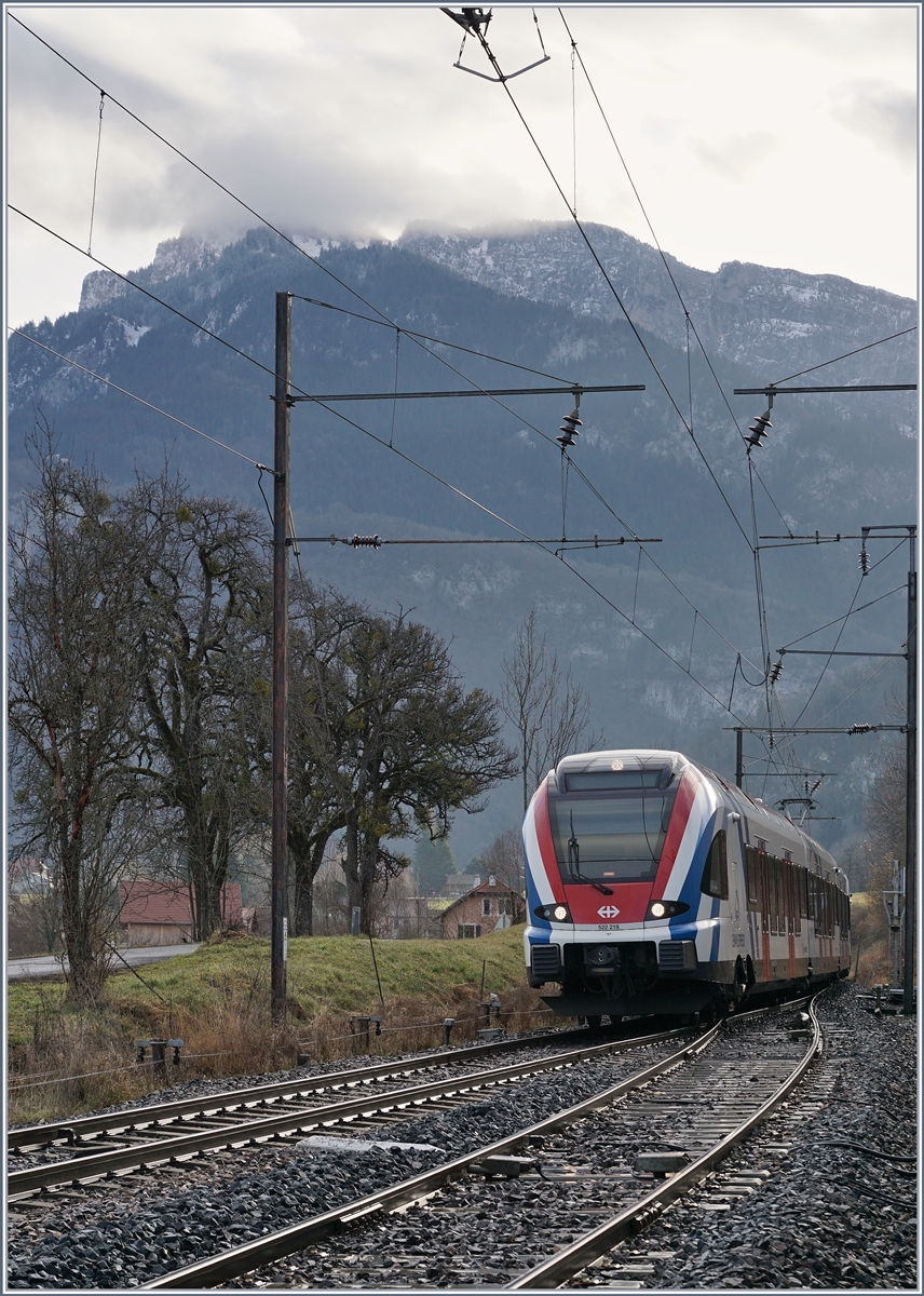Der SBB CFF LEX RABe 522 218 (und ein weiterer) erreichen auf der Fahrt als SL2 23414 von Coppet nach Annecy den Bahnhof von Saint Laurent.