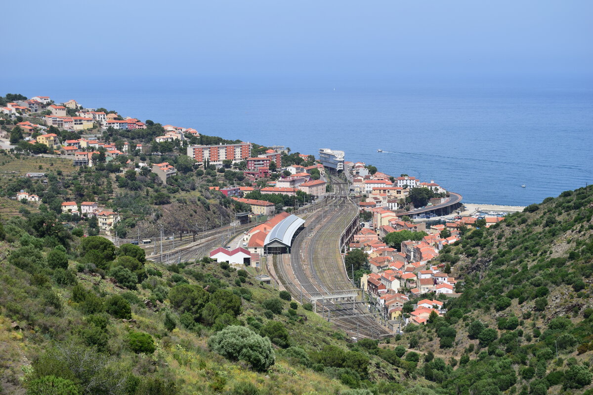 Blick auf den Grenzbahnhof Cerbère in Frankreich. Links hinter dem Berg verstecken sich die gewaltigen Umlade und Umspuranlagen für das spanische Breitspurnetz. Der Verkehr in Cerbere ist recht überschaubar. Es gibt Regionalzüge nach Avignon und zum spanischen Grenzbahnhof Port Bou und den Nachtzug nach Paris Austerlitz.