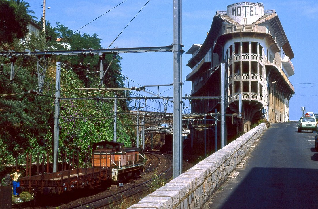 SNCF-Gleichstromlok 7283 mit spanischen Talgowagen im Jahr 1988 auf der Strecke von Perpigan-Narbonne in Höne des südfranzösischen Örtchen Salses-le-Chateau. Auf der rechten Bildseite ist das mächtige Fort erkennbar. Ernst Lauer